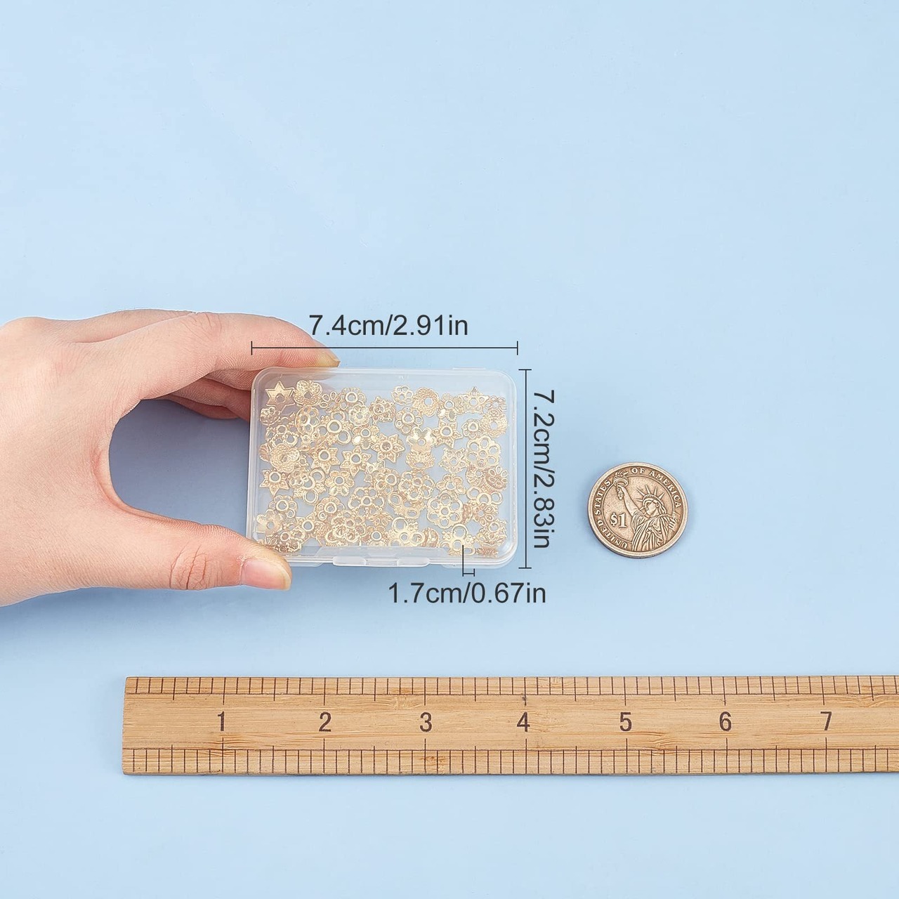 【サイズと数量】:18k鍍金ビーズキャップ*80個10種:各8個で、合計80個です。最大のは花ビーズキャップ:10x9.5mm、穴:1.6mmで、最小のは花ビーズキャップ:6*2mm、穴:0.8mmです。収納ケース*1つ:7.4x7.2x1.7cm。