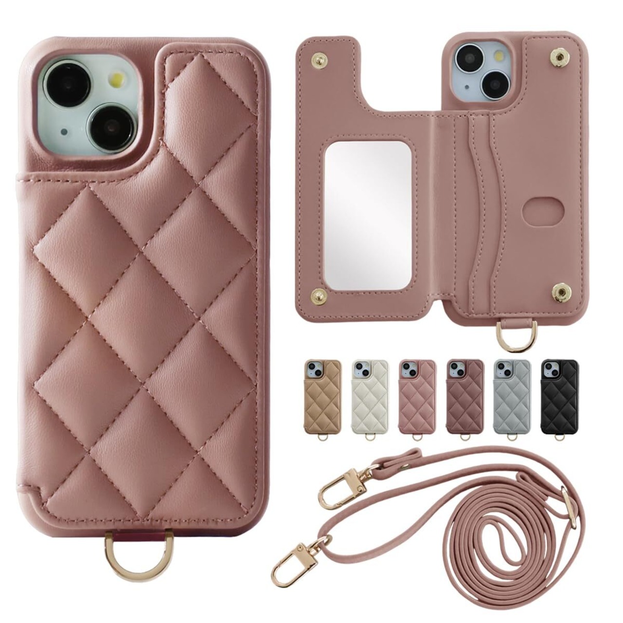 【N-design 】互換品 ケース iphone13 iphone14 兼用 ケース スマホ ショルダー iphone 13 14 カバー 首掛け 肩がけ 斜めかけ 紐付き キルティング アイフォン 13 14 用 ケース ストラップ付き 韓国 可愛い (PINK, iPhone13/14兼用)