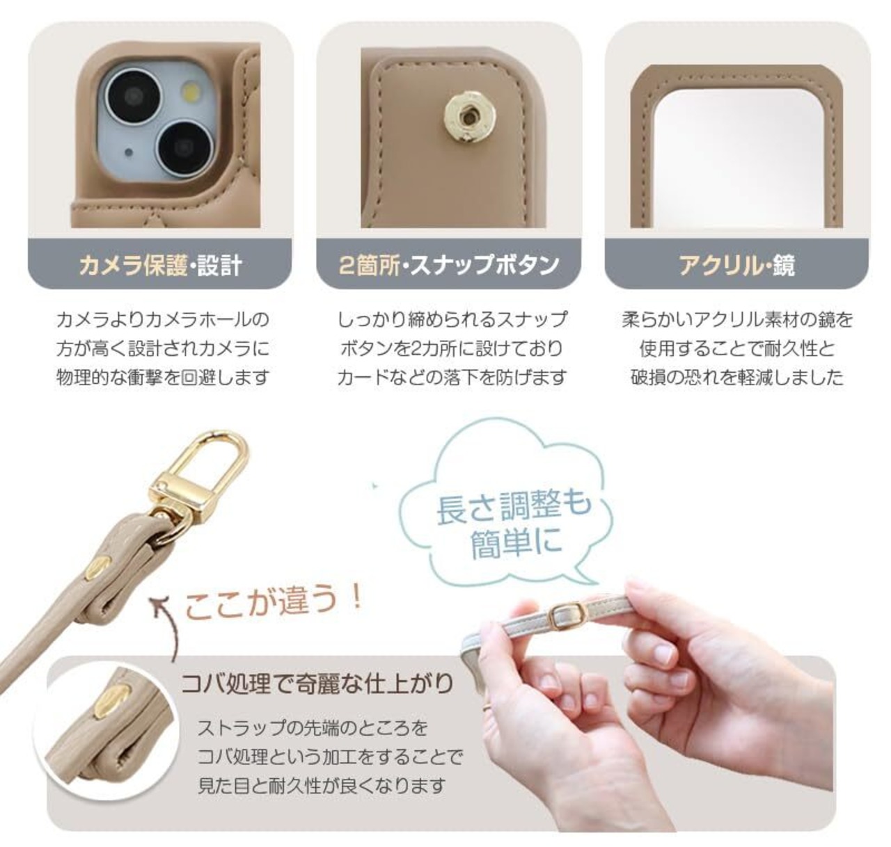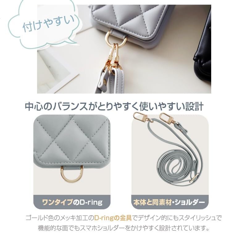 【ショルダーストラップ】長さ調節・取り外しが可能なショルダーストラップ付き。ストラップの長さは自由に調節できるため、さまざまなシーンで快適にご利用いただけます。肩から下げて使えば、手が空くのでショッピングやお散歩、旅行などの場面でも非常に便利。スマートフォンをサッと取り出して操作ができるため、操作性も抜群です。また、取り外しが簡単なので、不要な時は簡単に外してハンドバッグとしてもご利用いただけます。