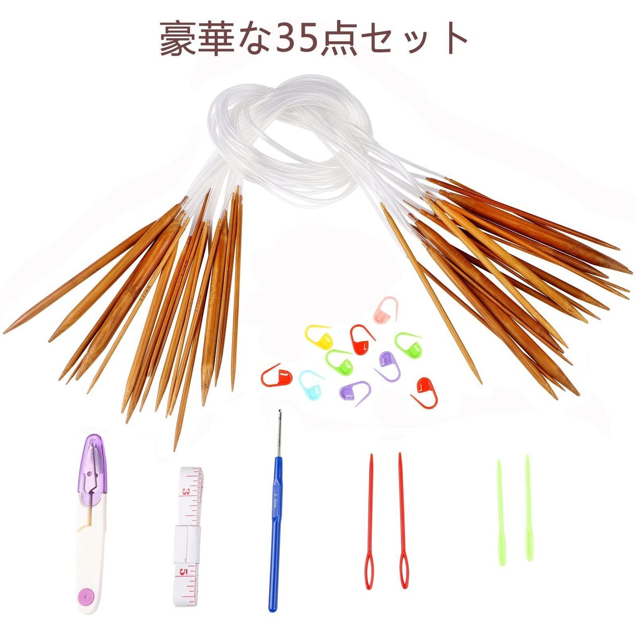 【輪針セット】セット内容:輪針は18本、またかぎ針1本・巻尺1本・ハサミ1本・とじ針4本・段数マーカー10個を贈ります。 輪針の長さ:コードは52cm、針は各14cmで計80cmです。