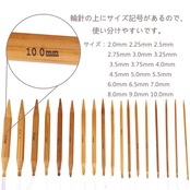 【輪針サイズ】2.0mm 2.25mm 2.5mm 2.75mm 3.0mm 3.25mm 3.5mm 3.75mm 4.0mm 4.5mm 5.0mm 5.5mm 6.0mm 6.5mm 7.0mm 8.0mm 9.0mm 10.0mm 細いサイズから太いサイズまで揃っていて、手持ちの糸に合わせて使い分けができるので、とても便利です。 サイズがそれぞれの輪針に表示されており、初心者でも使いやすいです。