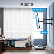 【角度が自由で見やすい】アームの左右角度調節は3か所があります。●壁側の取付け部は左右各90度で角度が調整できます。●アームとアームの接合部は壁面から45~480mmまで調整可能です。●テレビ取付け金具部は左右各3度、上向き5度、下向き15度で角度が調整できます。視聴場所に合わせてスタイルを自由自在に、楽々テレビが楽しめます。※テレビのサイズにより角度調節範囲は変化する場合があります。