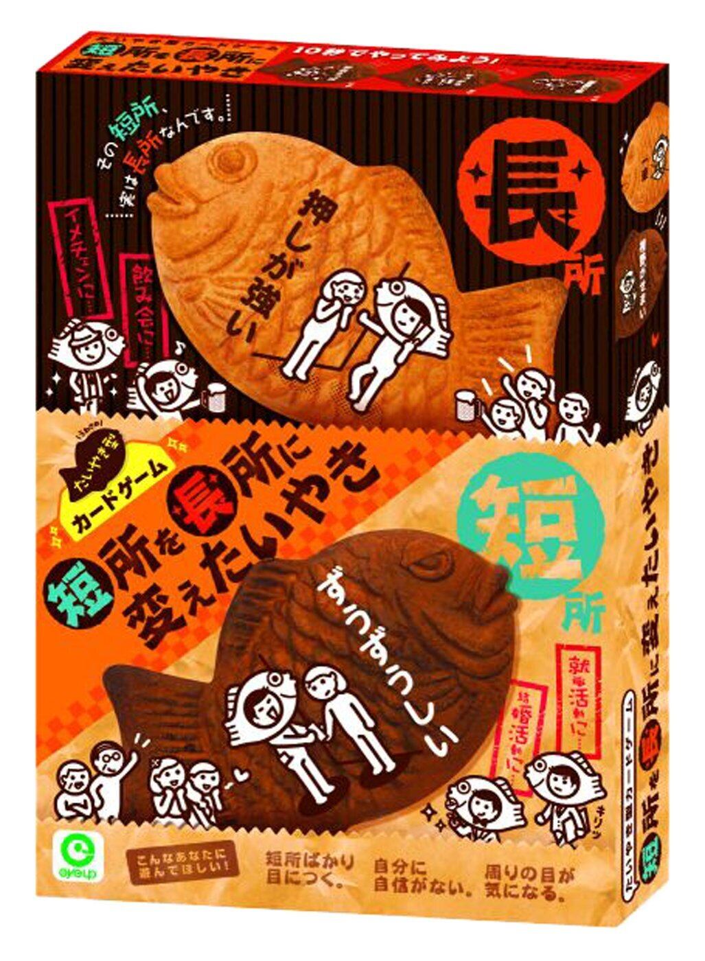 人は誰でも自分に自信がなく短所ばかり目に入り、また他人からどう思われているのか気になるもの。普段はしつこくて敬遠されている人が、仕事ではねばり強さを発揮したり。「短所を長所に変えたいやき」はそんな人に是非遊んでもらいたいゲーム。裏が短所、表に長所が書かれたたいやき型のカードを使って自分や相手の新しい面を発見出来る性格逆転ゲーム。自己啓発にも、合コン等にもおススメ。3種のゲームが楽しめる。ゲームがパッケージリニューアル。
