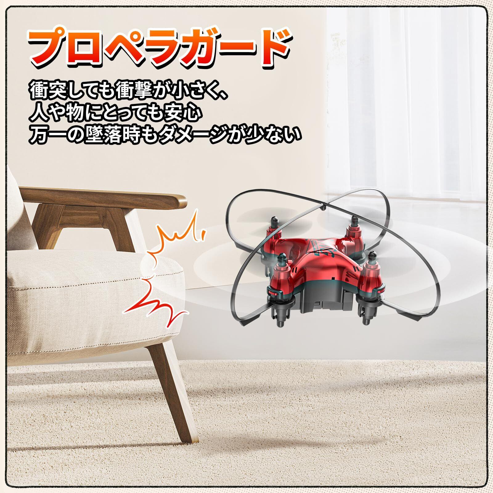 ️【プロペラガード付き】高弾性プラスチック製のプロペラガード付き、衝突しても衝撃が小さく、万一の墜落時もダメージが少ないので、安心して利用できます。