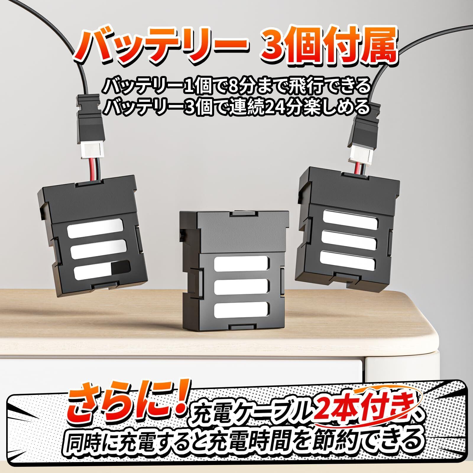 ️【バッテリー3個付属】バッテリー3個付き、1個の飛行時間が8分で、3個で合計24分まで延長できます。楽しい飛行体験をより長い提供します。また、充電ケーブルも2本付き、同時に充電すると充電時間も節約できます。