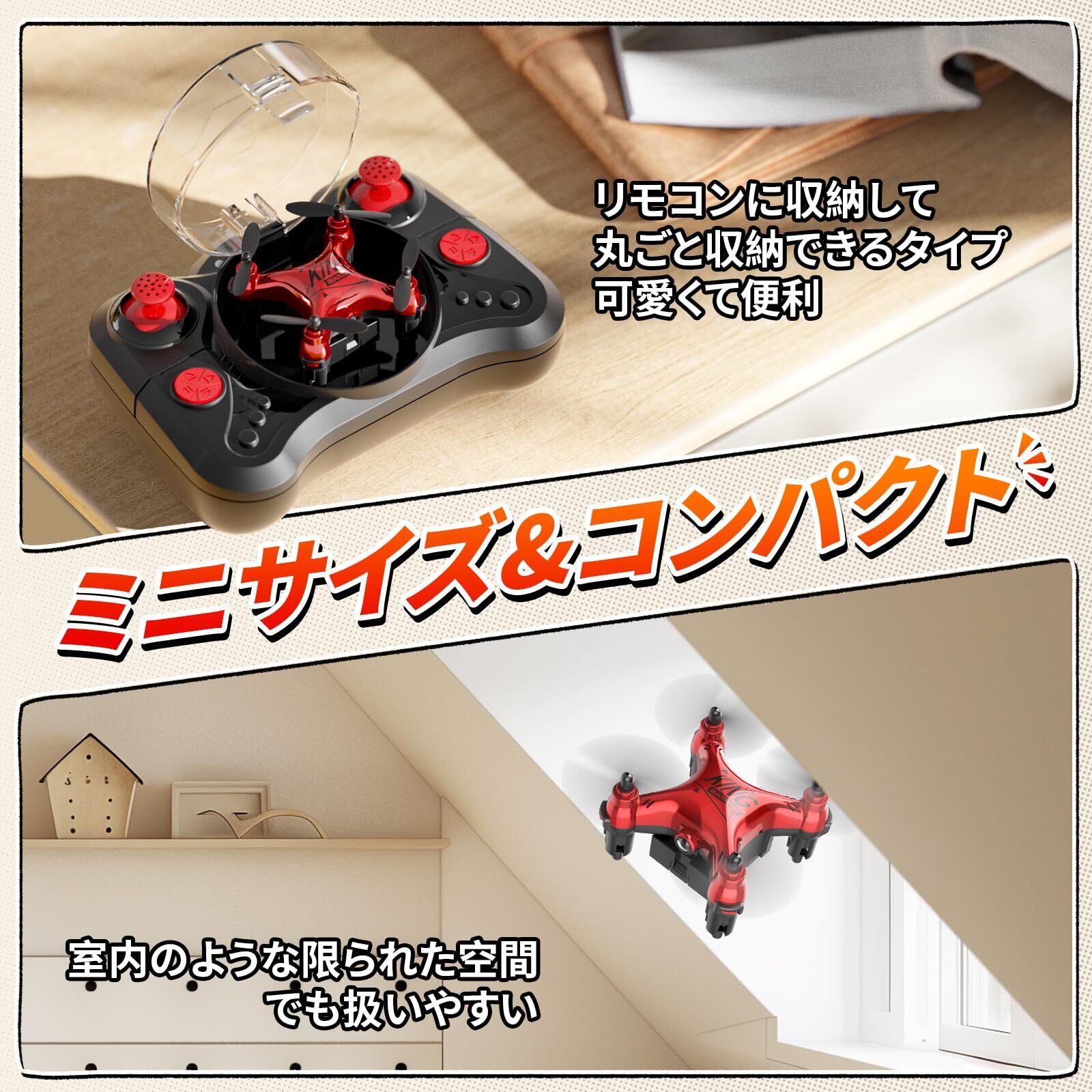 ️【送信機に収納できる】7*4.8*3.5cmのコンパクトなサイズ、送信機に入れて丸ごとに収納可能なので、可愛くて持ち運び・保管も便利です。また、ミニドローンのため、室内のような限られた空間でも扱いやすいです。