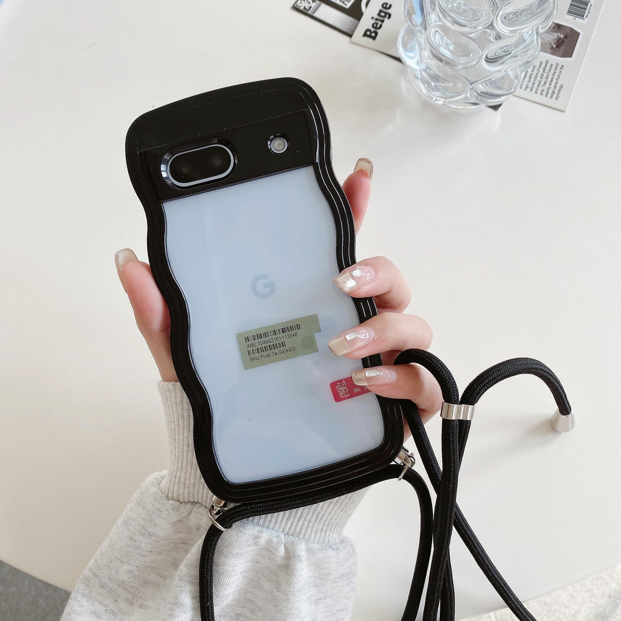 Google Pixel 8A かわいい クリアケース 波状フレームクリア ストラップ ショルダー 耐衝撃 グーグル ピクセル8A 6.1インチカバー 肩掛け 斜めかけ 縄掛けケース【長さ調整可能ブラック縄掛け付き】ウェーブ デザイン スマホカバー 韓国 可愛い 女子向け 人気 落下防止 紐付き 織りスト ネックストラップ ショルダー (Pixel 8A-ブラック)
