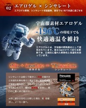 【宇宙服の次世代断熱素材エアロゲル】エアロゲルとは、宇宙服の断熱素材として使用されています。-196℃の冷気を集中噴射しても凍傷にならない、圧倒的に優れた断熱性と保温性を誇っています。