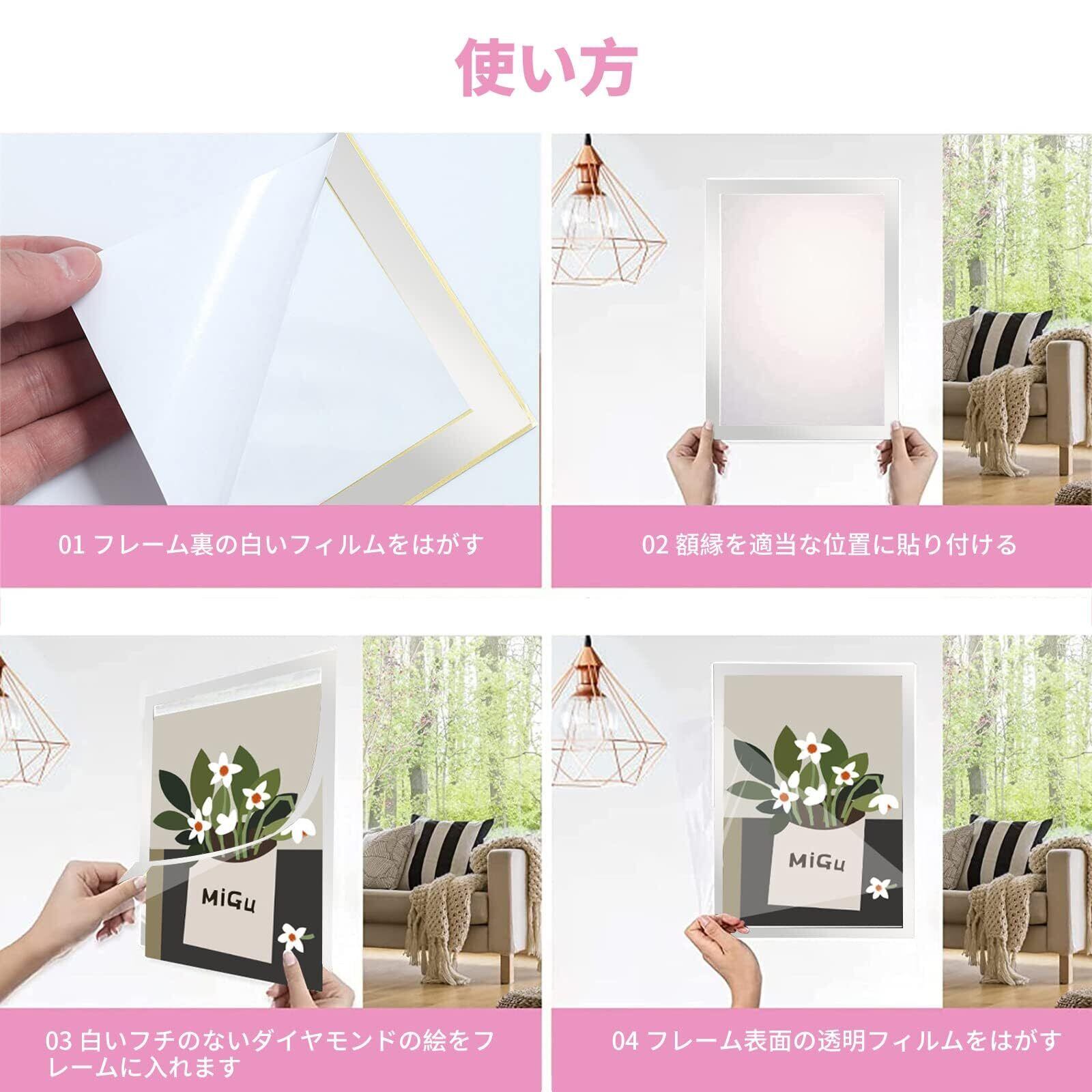 【取り付け簡単】フレームを取り付けるときに壁を傷つけることはもうありません。 フレームを開き、ダイヤモンドの絵を中に入れ、フレームの背面を滑らかな表面に取り付けるだけです、フレーム裏の白いフィルムをはがす、額縁を適当な位置に貼り付ける。
