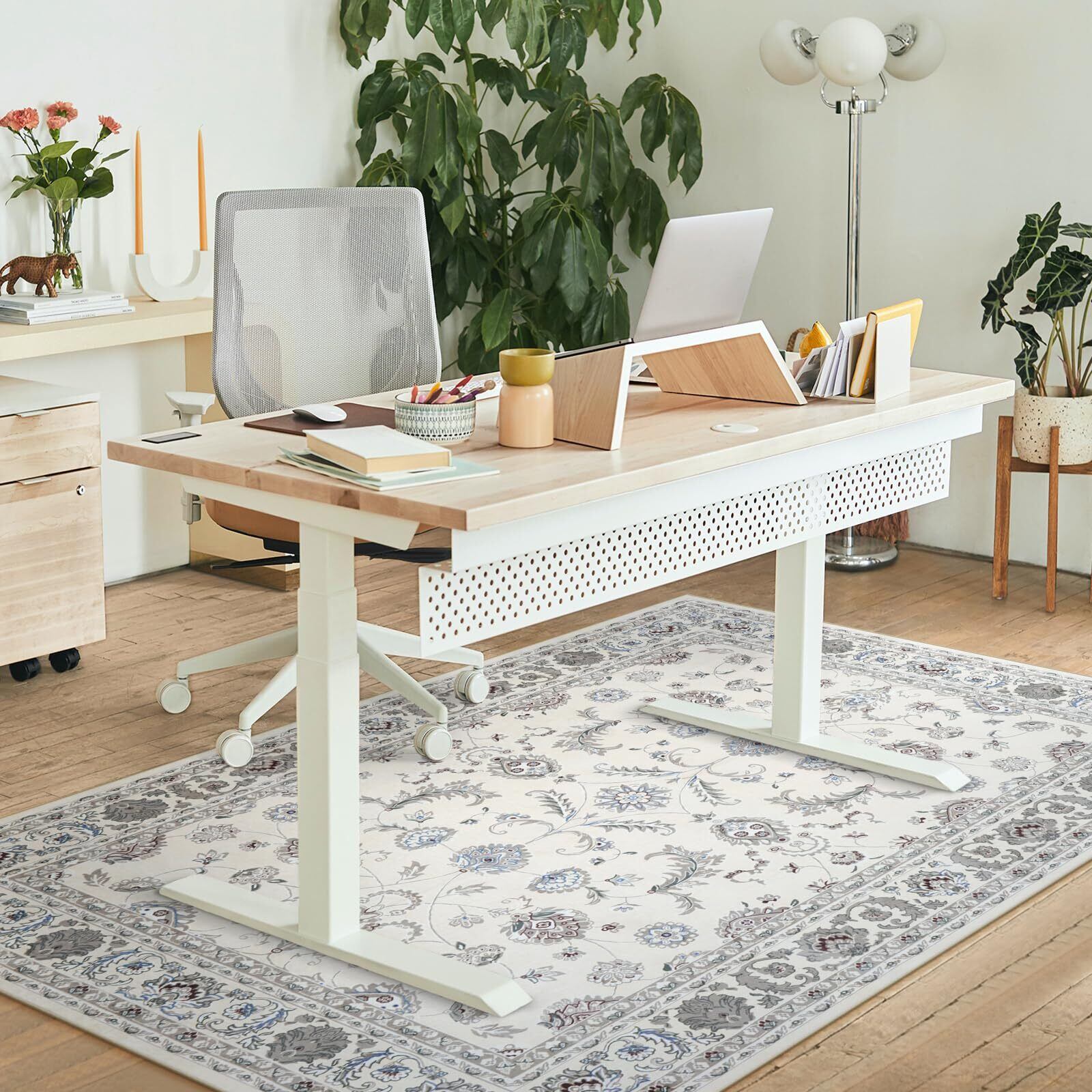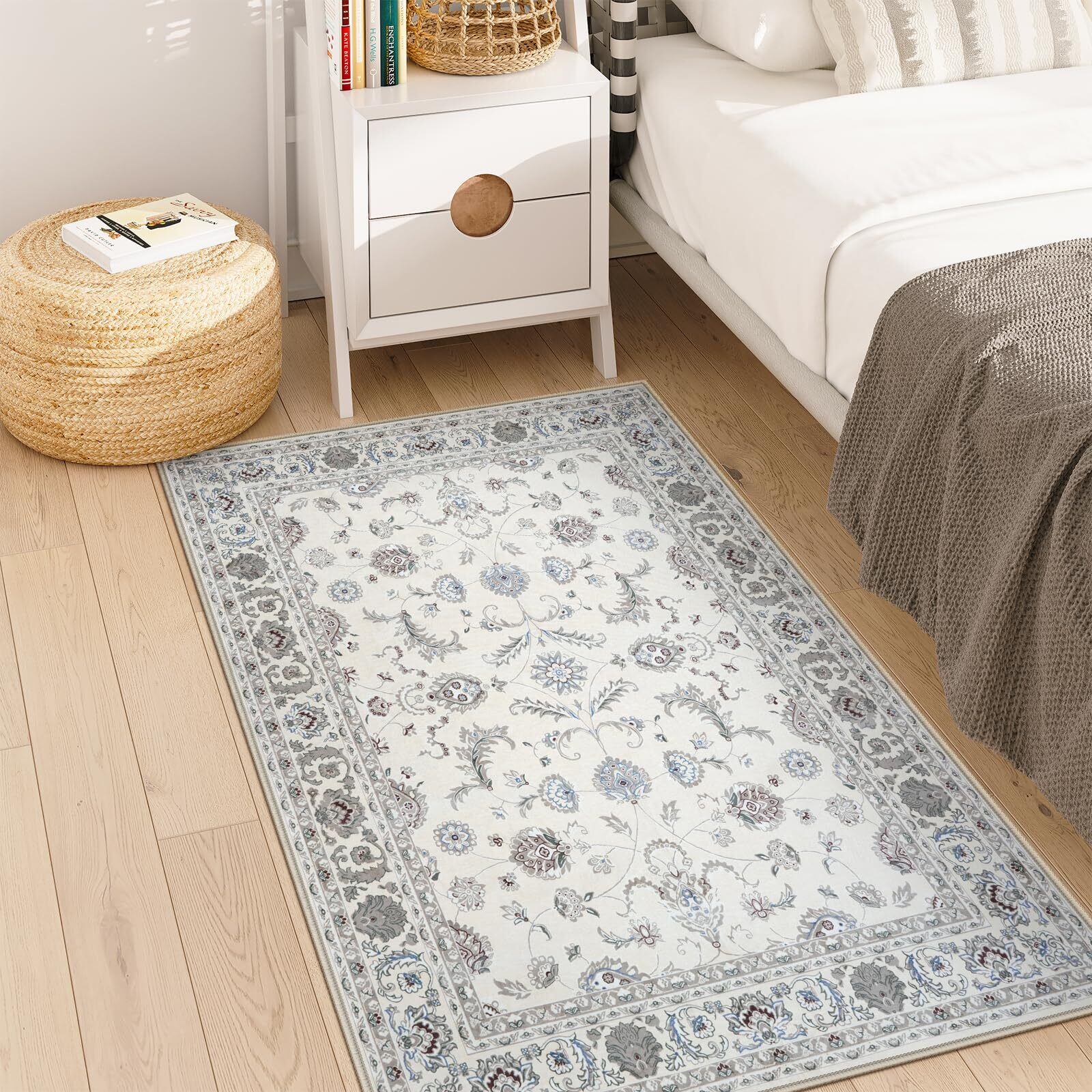 HAOCOO ラグ 洗える カーペット ペルシャ風 90х150cm おしゃれ 1畳 絨毯 耐磨耗性 滑り止め ホットカーペット対応 防音 ラグマット シェニール オールシーズン適用 抗菌防臭 軽量 花柄 オフホワイト