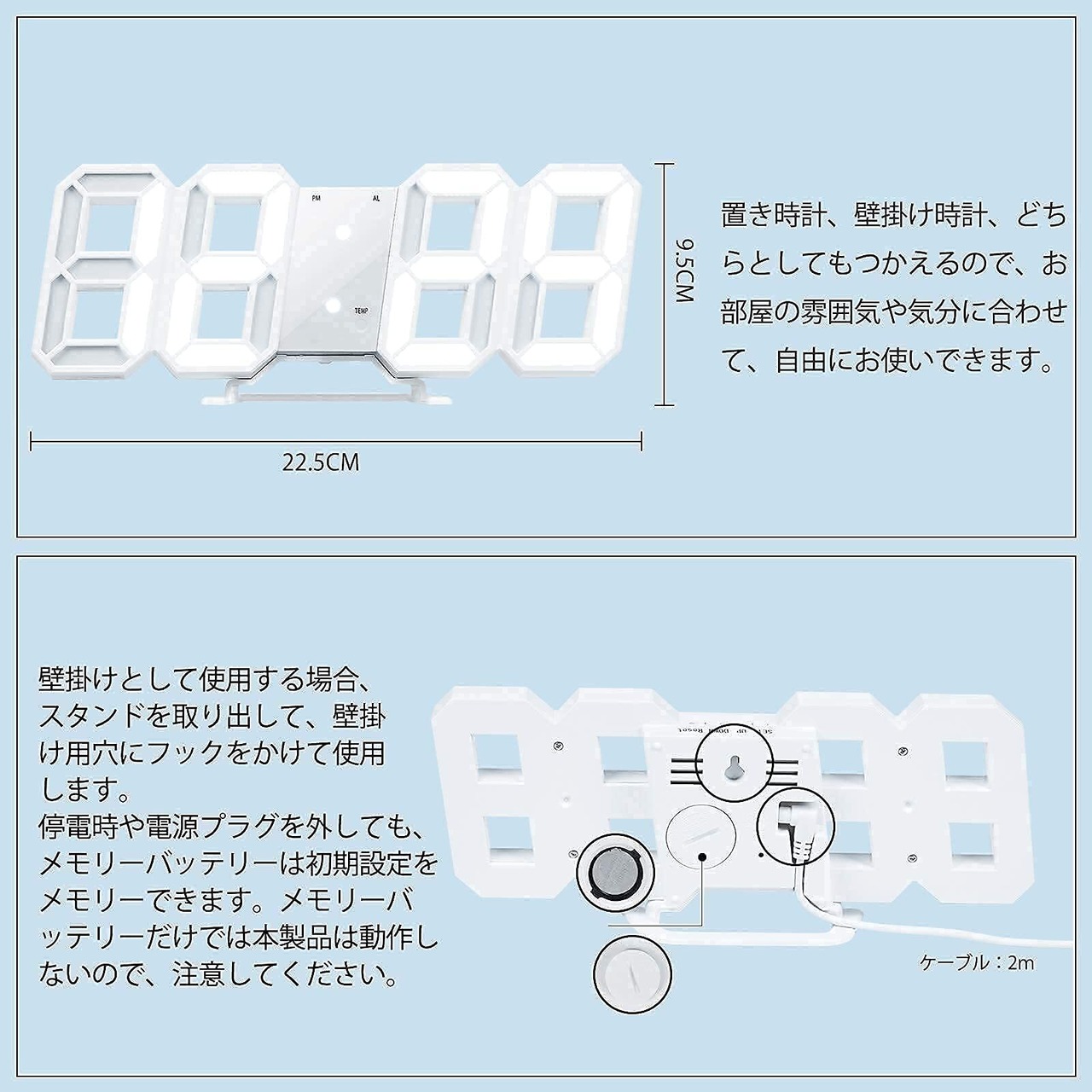 LEDデジタル時計 目覚まし 3D wall clock 置き時計 壁掛け スヌーズ アラーム 明るさ調整 ナイトランプ 年/月/日温度表示 キッチン 日本語取扱説明書付き 2022 アップグレード版 -- オーセンティックストア:FAVOR-VIV (白い, 青色光)