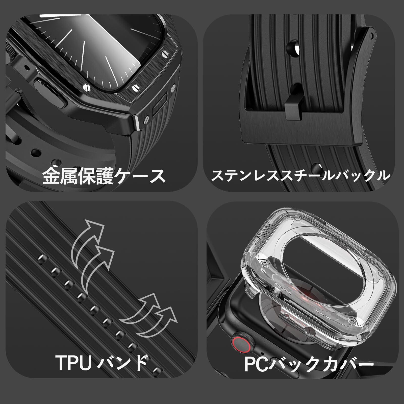 【高品質な素材】耐腐食性、耐摩耗性、耐酸性の高品質金属(Apple Watch保護ケース)とTPU(Apple Watch バンド)素材を採用、耐久性に優れています。また、精密な研磨技術と使いやすくファッショナブルな設計となっており、高級感あふれるApple Watchベルトとなっています。