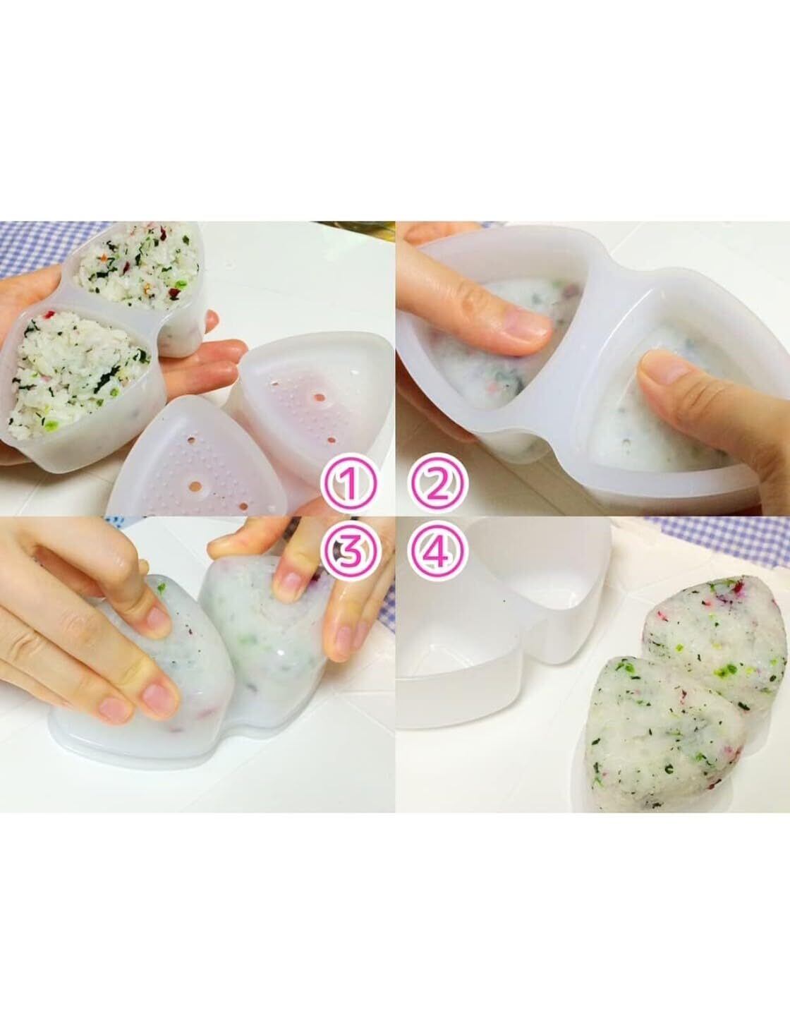 おにぎりをご飯と具材に入れ、プレス型にのせて数回押して裏返すだけ。