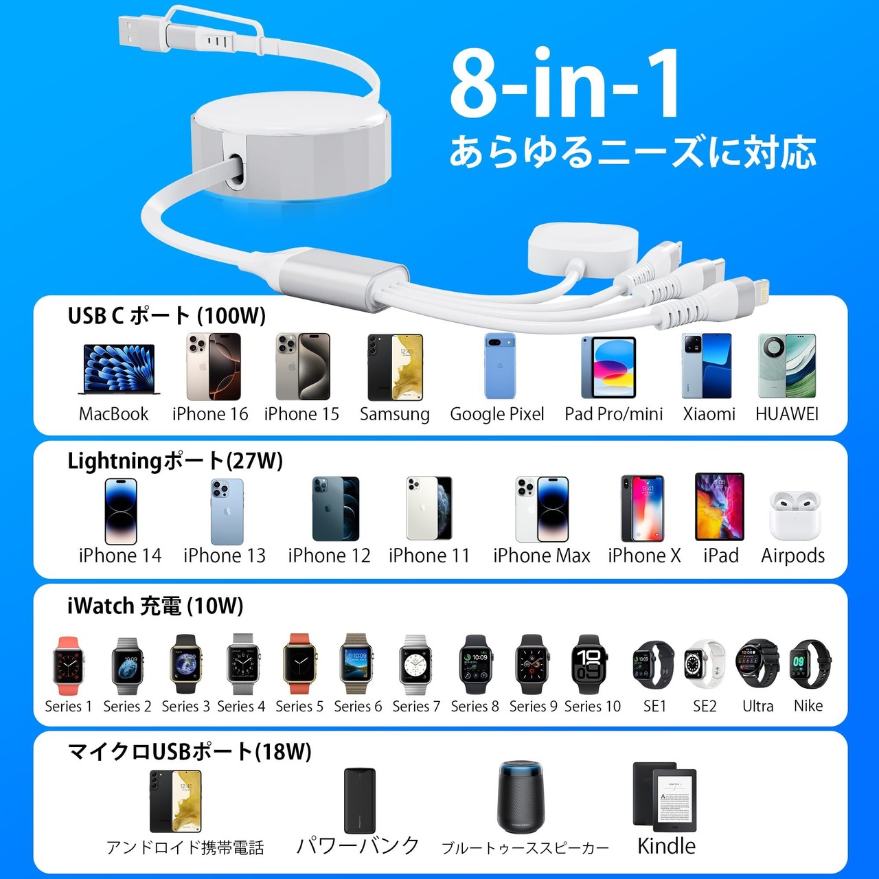 幅広い互換性: 磁気AppleWatch充電ポートは、すべてのiWatchシリーズUltra/10/9/8/SE2/7/6/SE/5/4/3/2/1と互換性があります。 LightningポートはiPhone 14/13/12/11/Pro/Pro Max/XSと互換性があり、USB-CポートはiPad、iPhone16シリーズ、iPhone15シリーズ、Macbook Pro、ラップトップ、Galaxyおよびその他のUSB-Cスマートフォンをサポートします。 Micro USB ポートは、ほとんどの Android スマートフォン、Kindle、Bluetooth ヘッドセット、PS4 コントローラーなどと互換性があります。複数のデバイスに対応した急速充電ケーブル