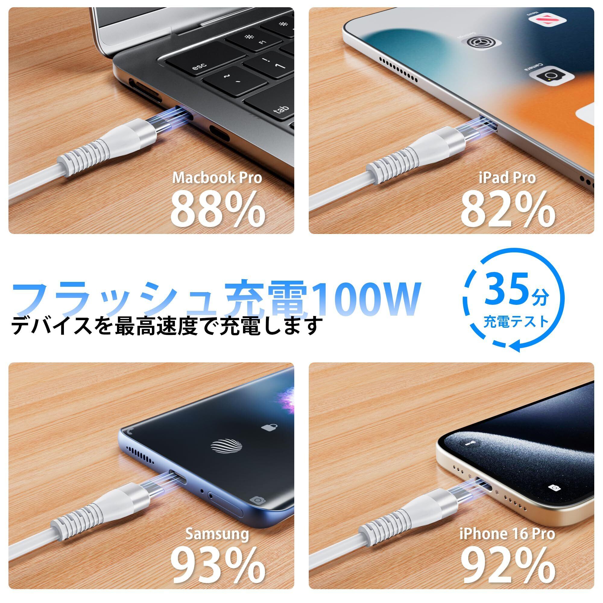PD 100W USB-C 高速充電: 最新の 6A 100W PD テクノロジーにより、前例のない体験がもたらされます。USB C - USB C ケーブル (最大 100W) を使用すると、iPhone 15 Pro を 35 分で 92% まで急速充電し、MacBook を充電できます。 1.9 時間で Pro を 100% にします。注: 実際の充電速度はデバイスと壁の充電器によって異なります。複数のデバイスを同時に充電すると速度が低下します。ご注意: * Type-C 出力のみ 100W 充電と 480Mbps データ転送をサポートし、他の出力は充電のみをサポートします。