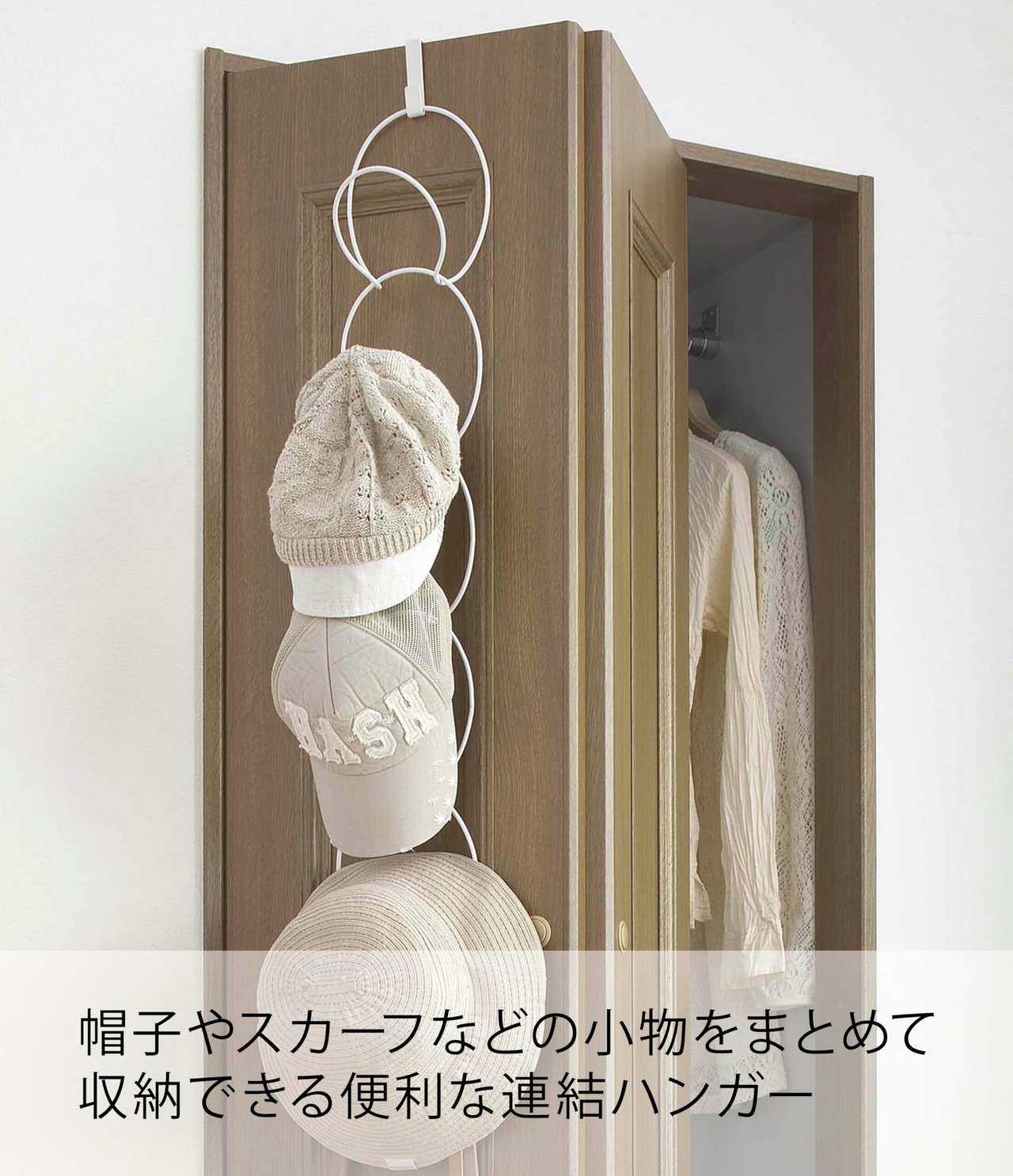繋げて分けて組合せ自在。簡単連結! リングとリングを引っ掛けるだけ。帽子・スカーフ・小物雑貨をまとめて収納できる便利な連結ハンガー。