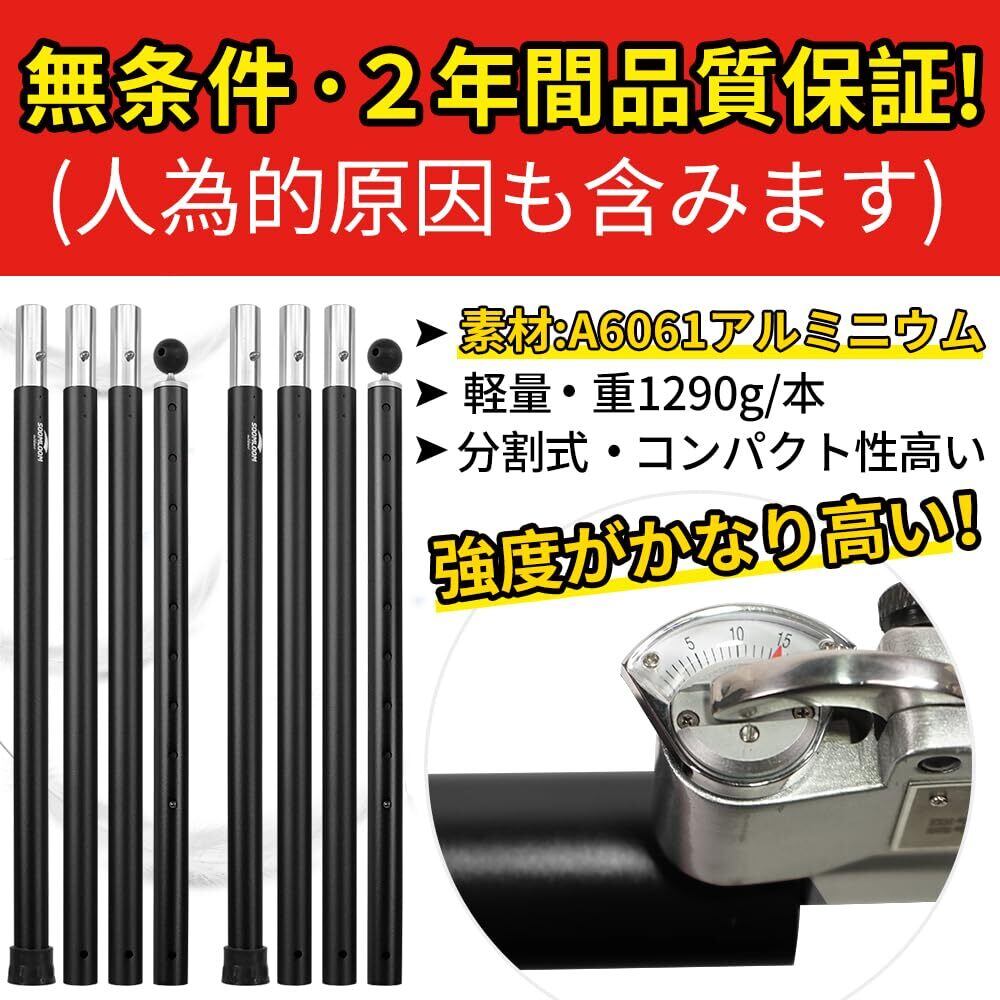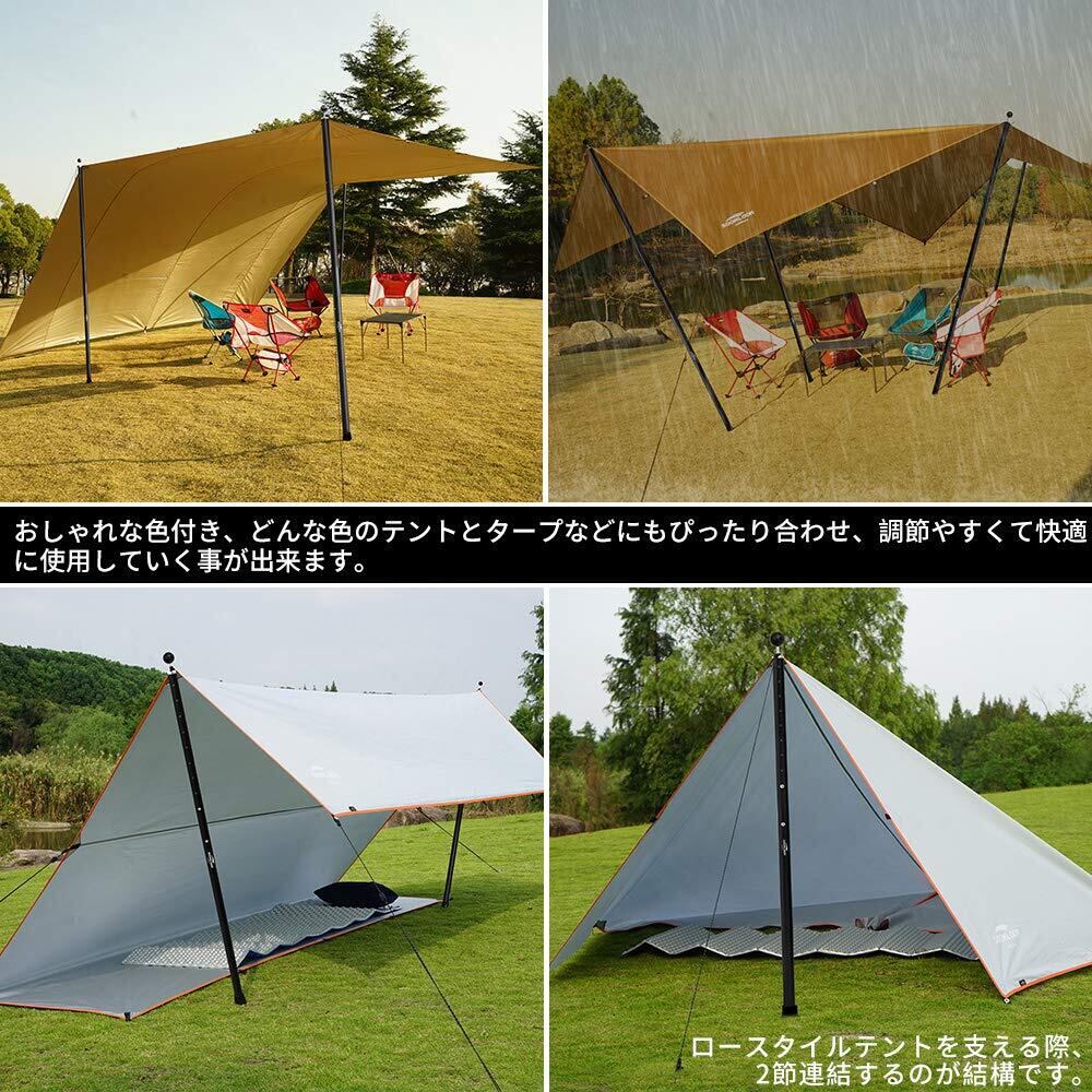 分割式ポール+プッシュアップトップ節:4節連結タイプで長さ調整範囲が120cm~280cmの間で24段階まで長さがアレンジできます。 連結本数によって60cmごとに長さ調節可能、120cm・180cm・240cm三段階とプッシュアップトップ節によって5cm/10cmごとに長さ調節可能、10cm+5cm+5cm+5cm+5cm+5cm+5cm七段階で自由に伸縮可能、数多い段階で長さを選べます。ポールの高さと低さを簡単に調整して高低差を作って防雨・防風対策にアレンジできます。