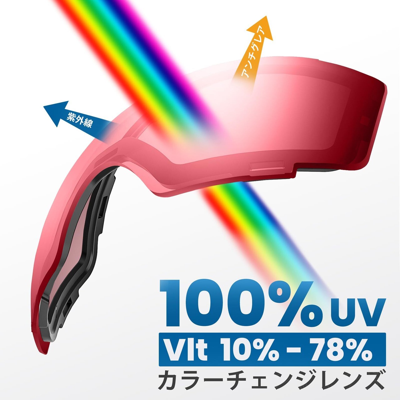 【UV-400&紫外線100%カット】 二層レンズはUV400保護処理を施されていて、光の反射やUVA、B、Cの紫外線とも100%カットできます!雪山の眩しさを抑え、凹凸な地形を鮮明に映し、スキーの安全性を保証し、しっかりと目を守ってます。OUTDOORMASTER高解像度なレンズにより、光学的な透明性を提供だけでなく、より快適で目にやさしく、視認性もかなり高くなります。