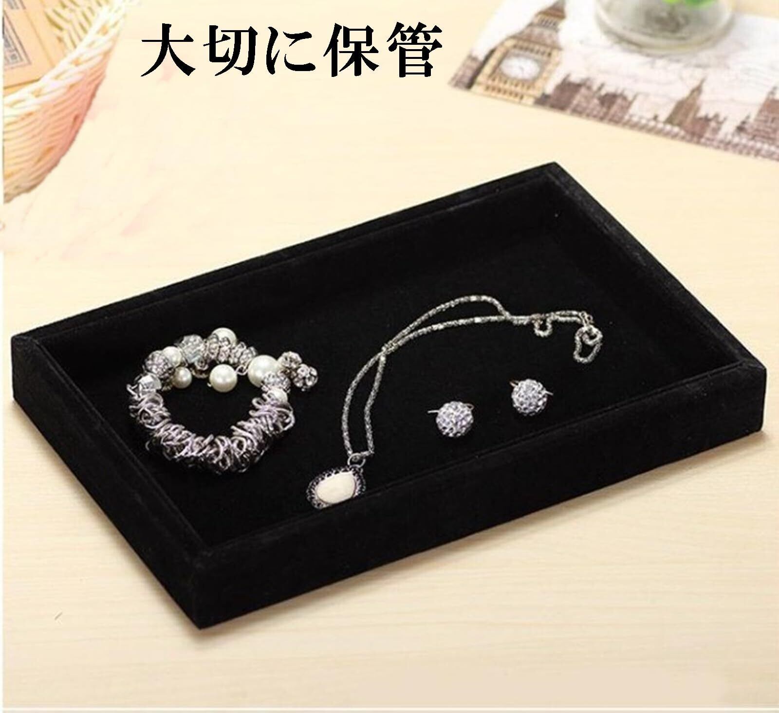 優雅な光沢をもつベロア素材の仕切りの無いシンプルで小さ目のフラットトレイ!黒のベロア生地が、大切なジュエリーをより美しく見せ てくれます。