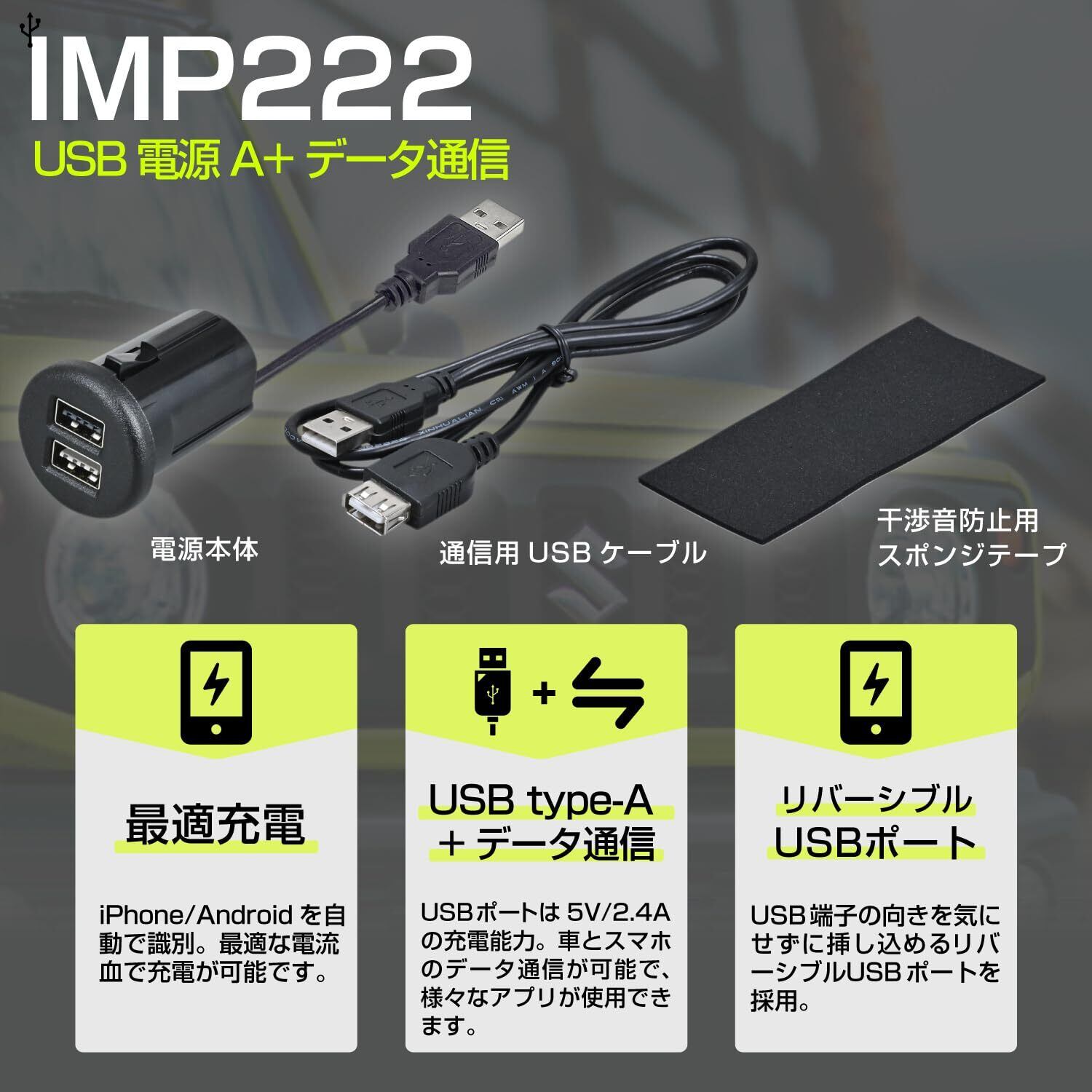 ●最大出力5V/2.4A×1口+データ通信×1口/端末自動認識IC搭載。
