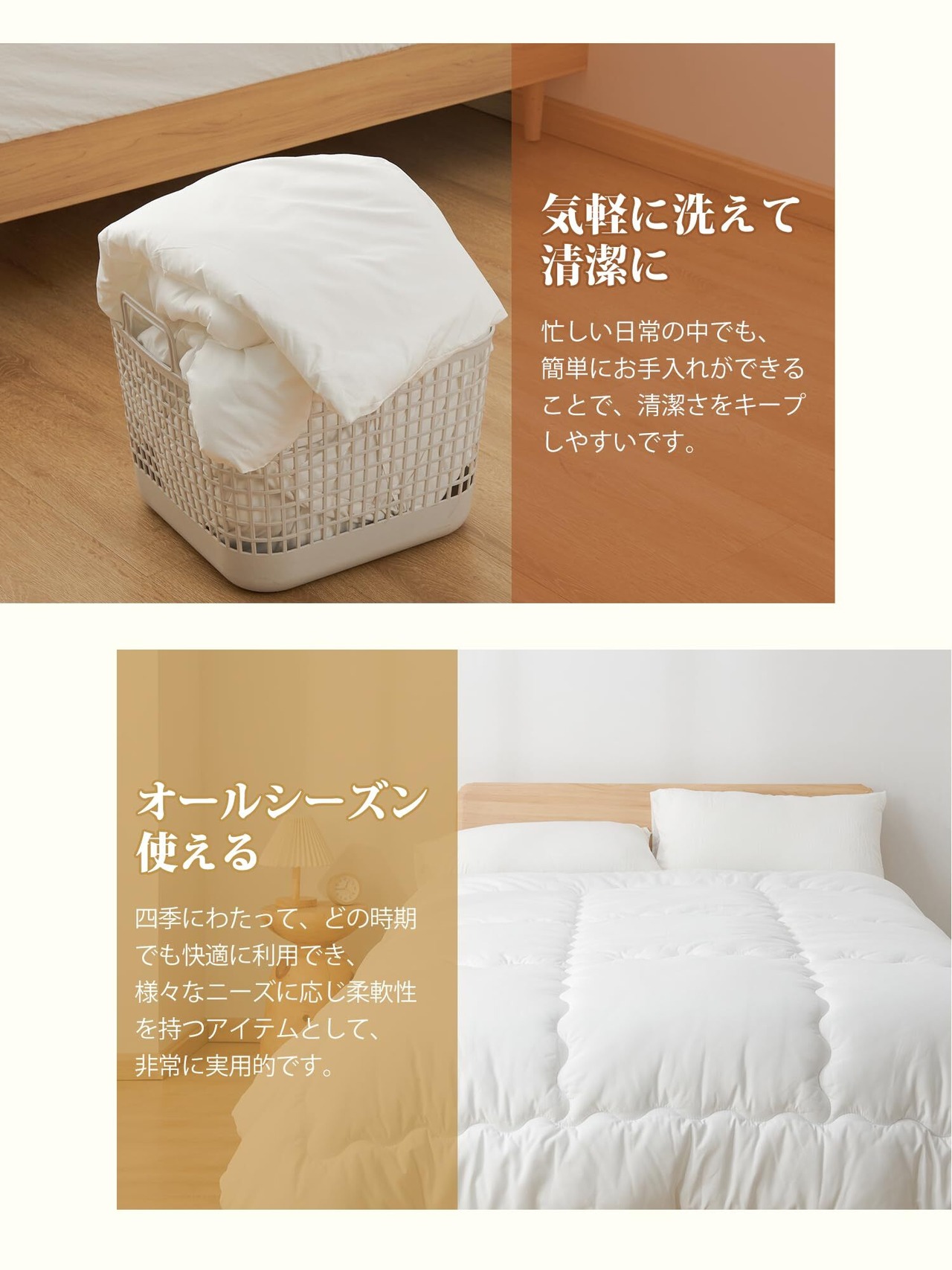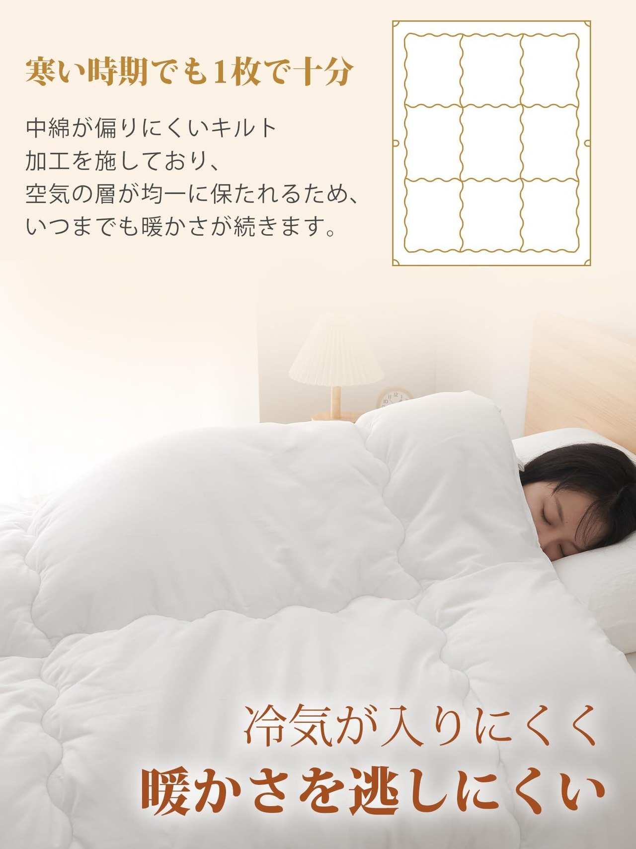 【1枚でオールシーズン快適に】軽量でありながら、保温性に優れた素材を使用しているため、寒い冬の夜でも暖かく、春や秋には心地よい寝心地を提供します。