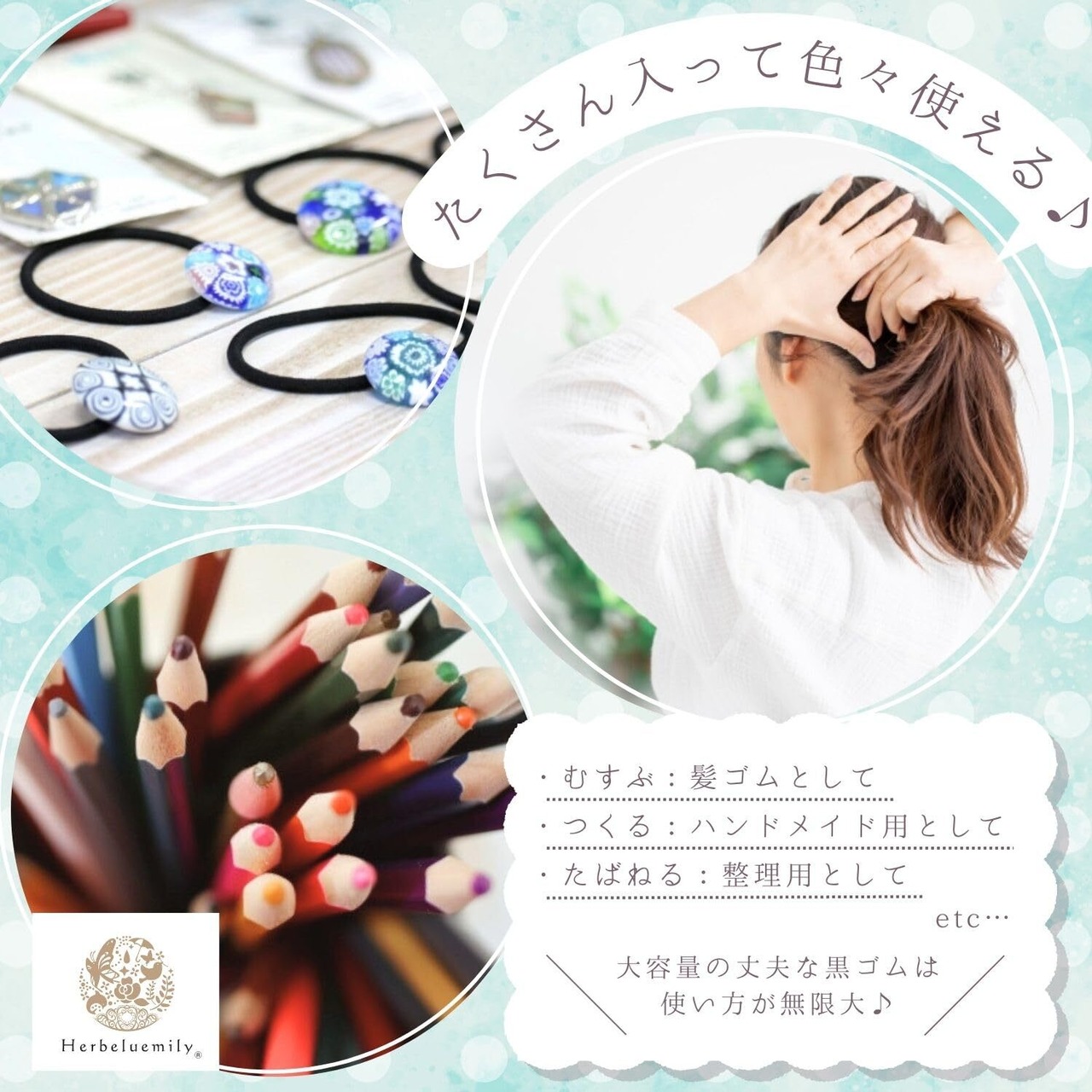 受験や面接、アルバイト、会社勤めの方など、きちんとした場面での使用はもちろん、ハンドメイドアクセサリーを製作する方にはパーツとしてもおすすめ!ヘアゴムとしてだけではなく、開封した袋の開け口を閉じたり、配線・コードのまとめなど、ライフハックでも役立ちます。