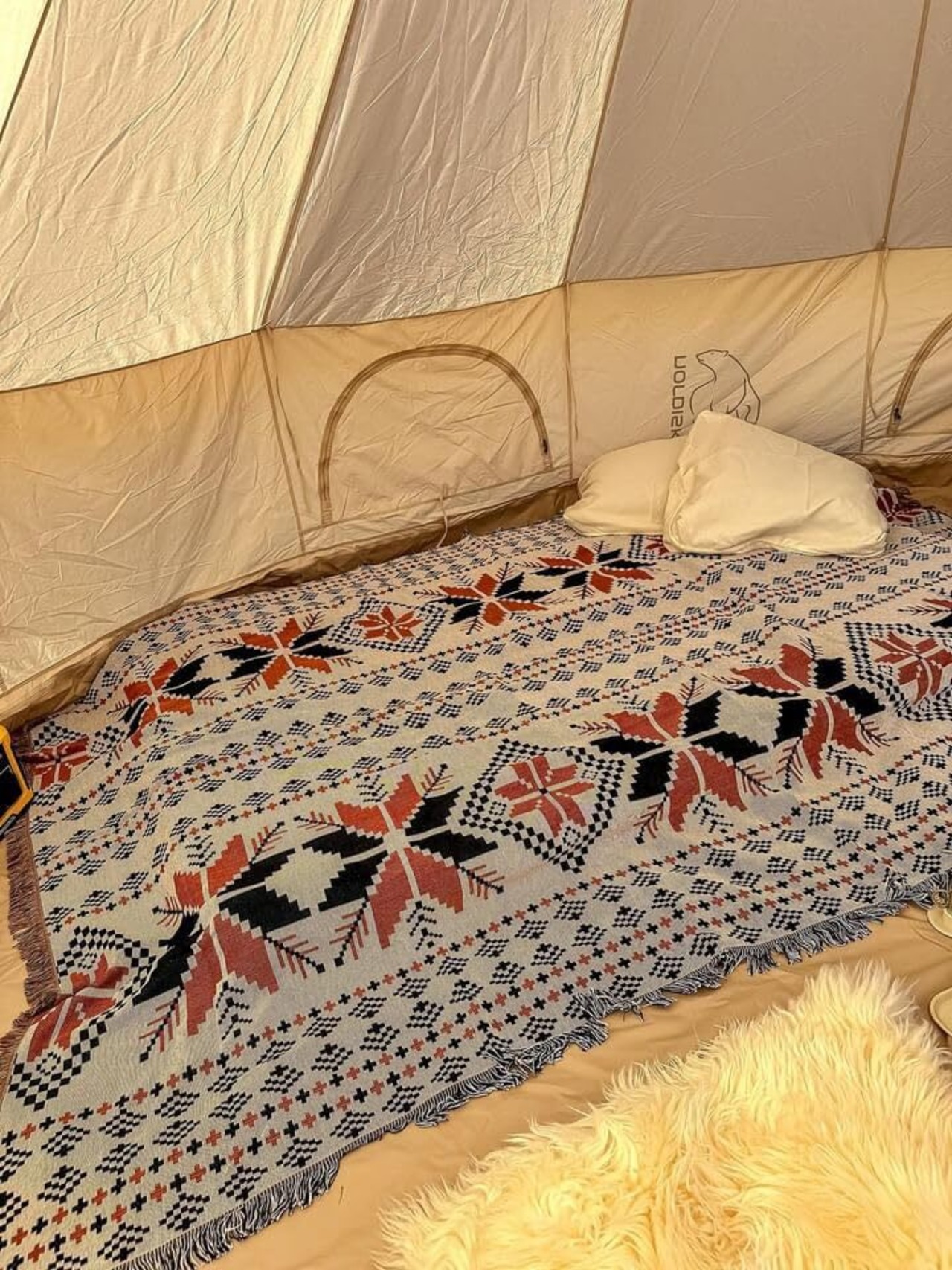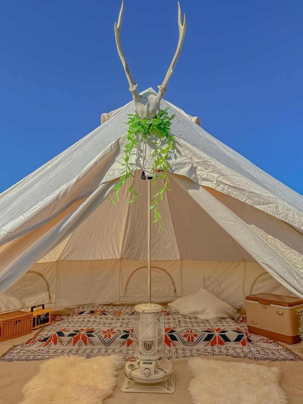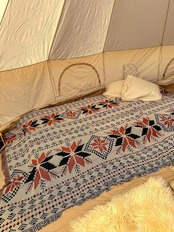 大判のメキシカンラグをコットの上に敷くだけで、まるで先住民が生活しているような空間に。ナチュラルな色あいのテントやテーブルに、メキシカンラグの派手めなデザインがマッチしています。