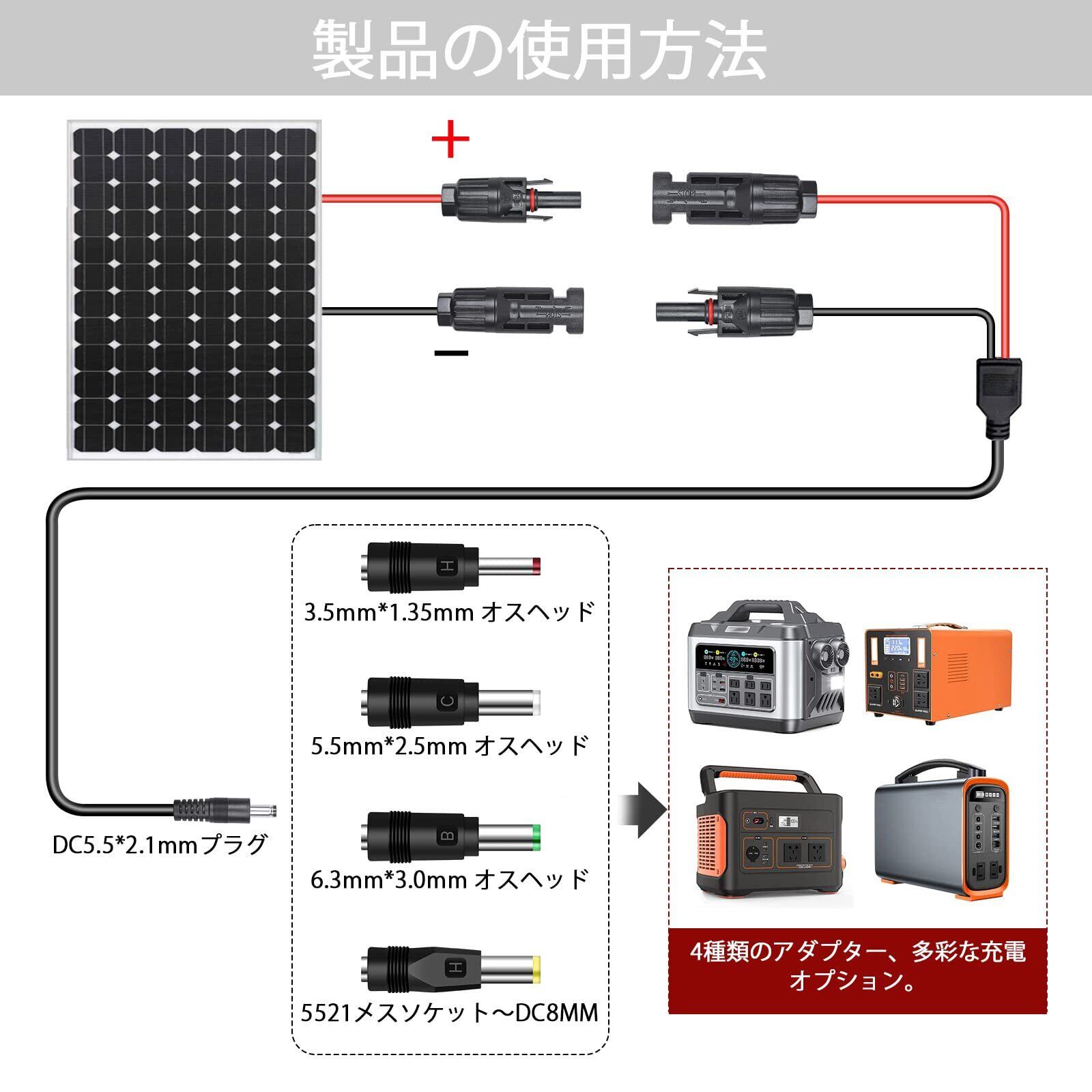 【用途】:携帯用ソーラーパネル、ソーラーパネルリュック、太陽電池などの予備電源接続に適しています。マザープラグMC4に適用して、ドローン/ノート/車上電器/充電器/自働車非常用電源に接続ラインをしますDC5521。