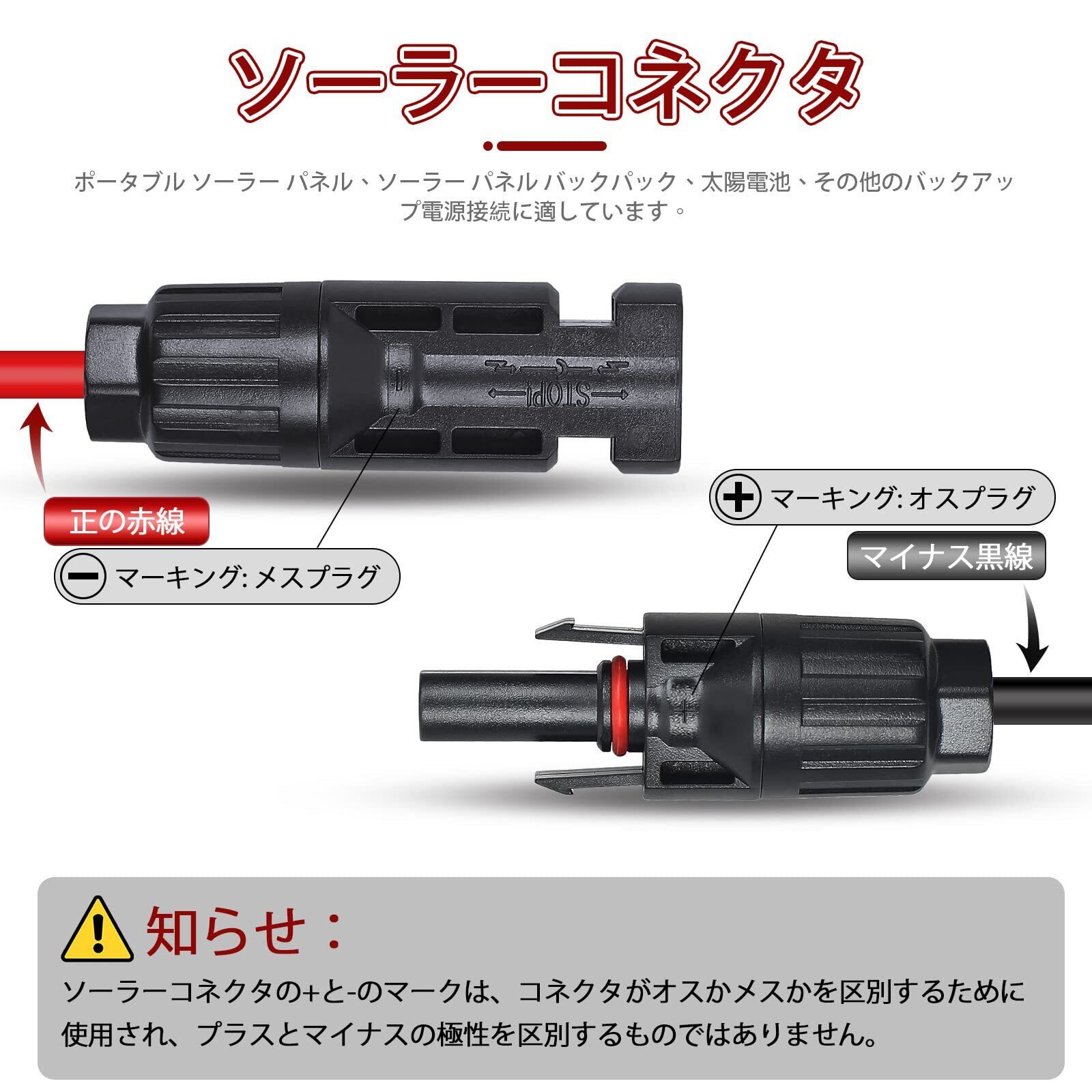 【注意】:太陽電池パネルコネクタのブランドによって極性が異なります。このMC4互換ケーブル上の親コネクタは正極で、赤線(MC4親コネクタ上)=正極性、黒線(雄コネクタ上)=負極性です。