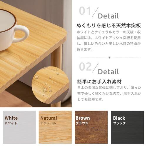 【ぬくもりを感じる天然木突板】ホワイトとナチュラルカラーの天板・収納棚には、優しい色合いと美しい木目が特徴的なホワイトアッシュ突板を使用。天然木の木目や風合いを活かすためラッカー塗装が施されています。汚れた場合は、湿ったタオルで優しく拭けばきれいになります。