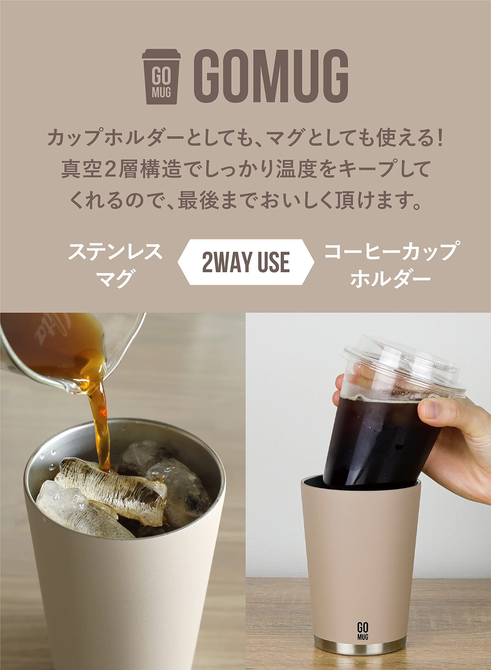 コンビニやコーヒーショップのコーヒーカップがすっぽり入る保温・保冷ステンレスマグ「GOMUG(ゴーマグ)」真空断熱2層構造でしっかり温度をキープしてくれるので、最後まで美味しくいただけます。