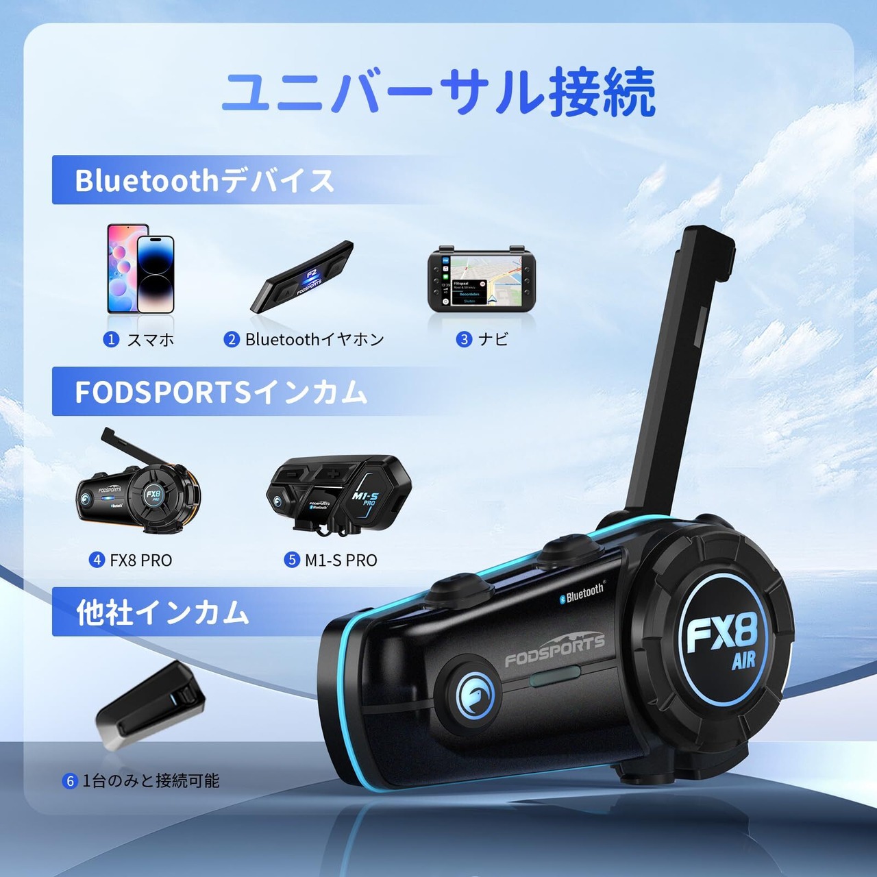 「Qualcomm Bluetooth5.0チップ&強い交換性」FX8 AIR進化版はクアルコム社の低消耗Bluetoothチップを採用しており、従来のモデルにより大幅な低消耗電力化を実現、接続速度、通話安定性、音質なども向上いたしました。先端なチップを利用して、他のBluetooth設備と強い交換性があります。多くのBluetoothデバイス(インカム/トランシーバー/Bluetoothイヤホン/パソコンなど)と接続可能です。Fodsportsのインカムはもちろん、他メーカーのインカムとの接続も可能です、インカム通信は便利になります。また、FX8 AIRインカムは2台スマホと同時に接続可能です。※同時に利用不可、自由自在に切り替えできます。