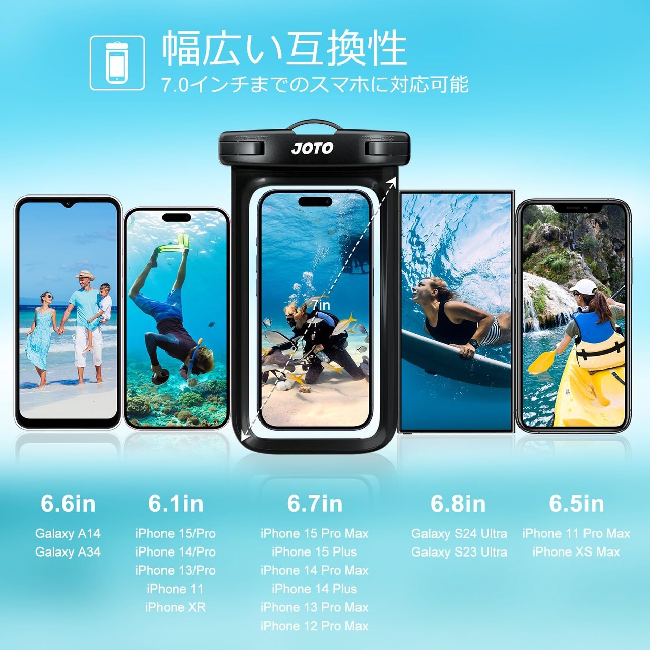 【対応機種】この防水ケースはクリーンサイズが7.0インチ以下のスマホ全数対応可能;また、85mm x 170mm (クリア部分 82mm X 162mm)までのデバイスも対応します。