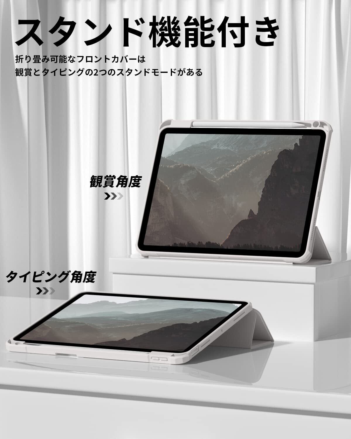 【材料・透明バックカバー】 ケースの表面はPUレザー素材を利用して、軽量、超薄を備えます。ポリカーボネート素材を採用している透明バックカバーは汚れや傷つけなどを防止するだけでなく、iPad本体の色と美しさも活かせます。透明バックカバーの枠は柔軟な TPUを採用して、取り付けも簡単にできます。フロントカバー内部材質はマイクロファイバーで、摩擦によって発生する傷を抑え、液晶画面を保護しきれいに保ちます。