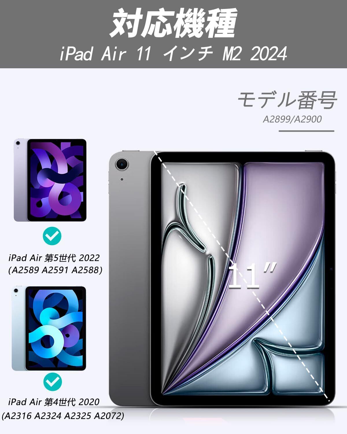 【対応機種】新型 iPad Air 11インチ M3/M2 2025 2024、iPad Air 第5世代 /第4世代 10.9インチ 2022 2020年発売モデル (対応モデル番号 A2588, A2589, A2591, A2316, A2324, A2325, A2072) ご注意:iPad、iPad Pro、iPad Miniなどの他の機種には対応できません。