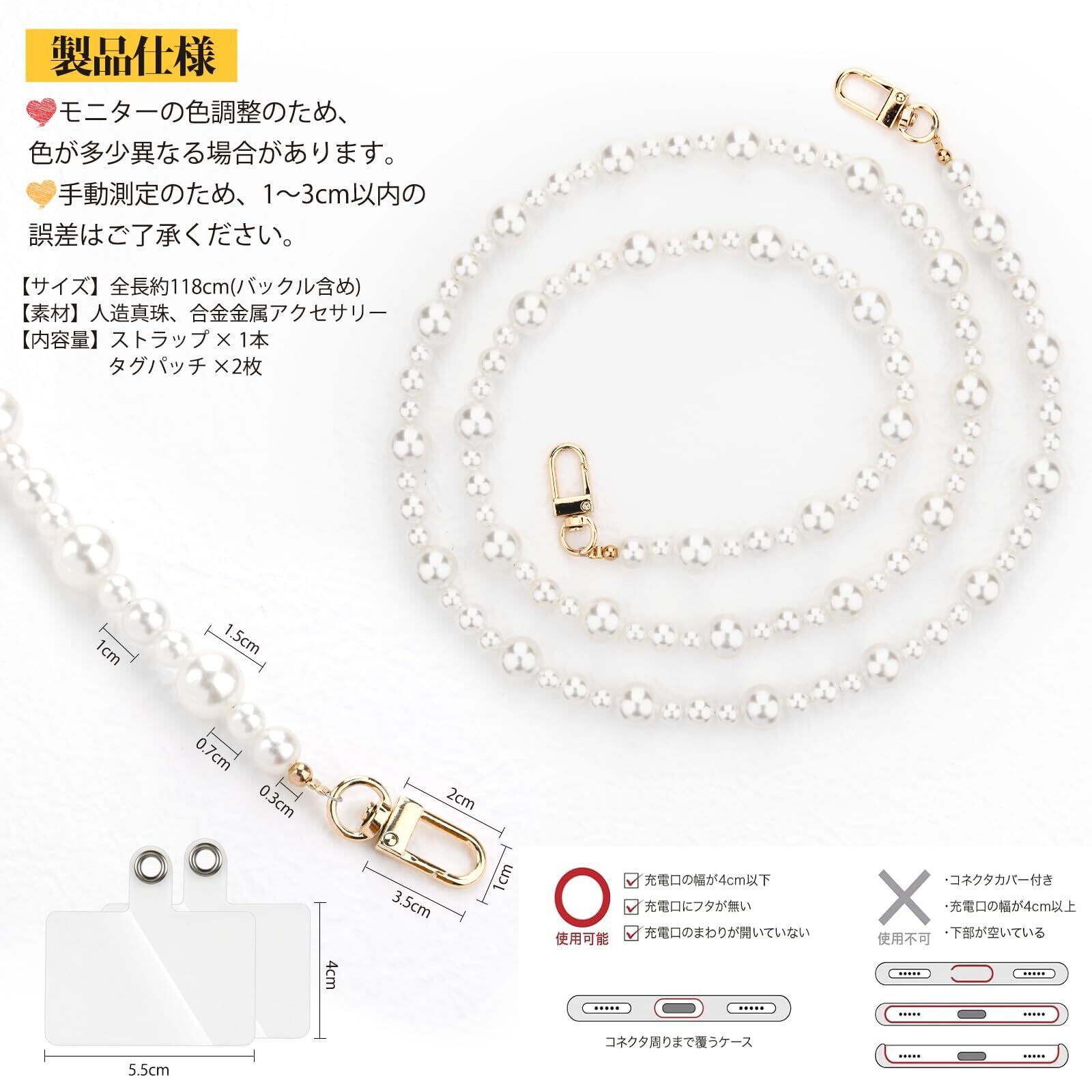 【製品仕様】◆対応機種 :全機種対応。◆ 内容物:パールストラップ × 1本、タグパッチ ×2枚。◆ 素材 : 人工パール、メタル◆ サイズ : 約 118cm(手動測定のため、1~3cmの誤差があります。) ◆ 重量 : 約 55g。