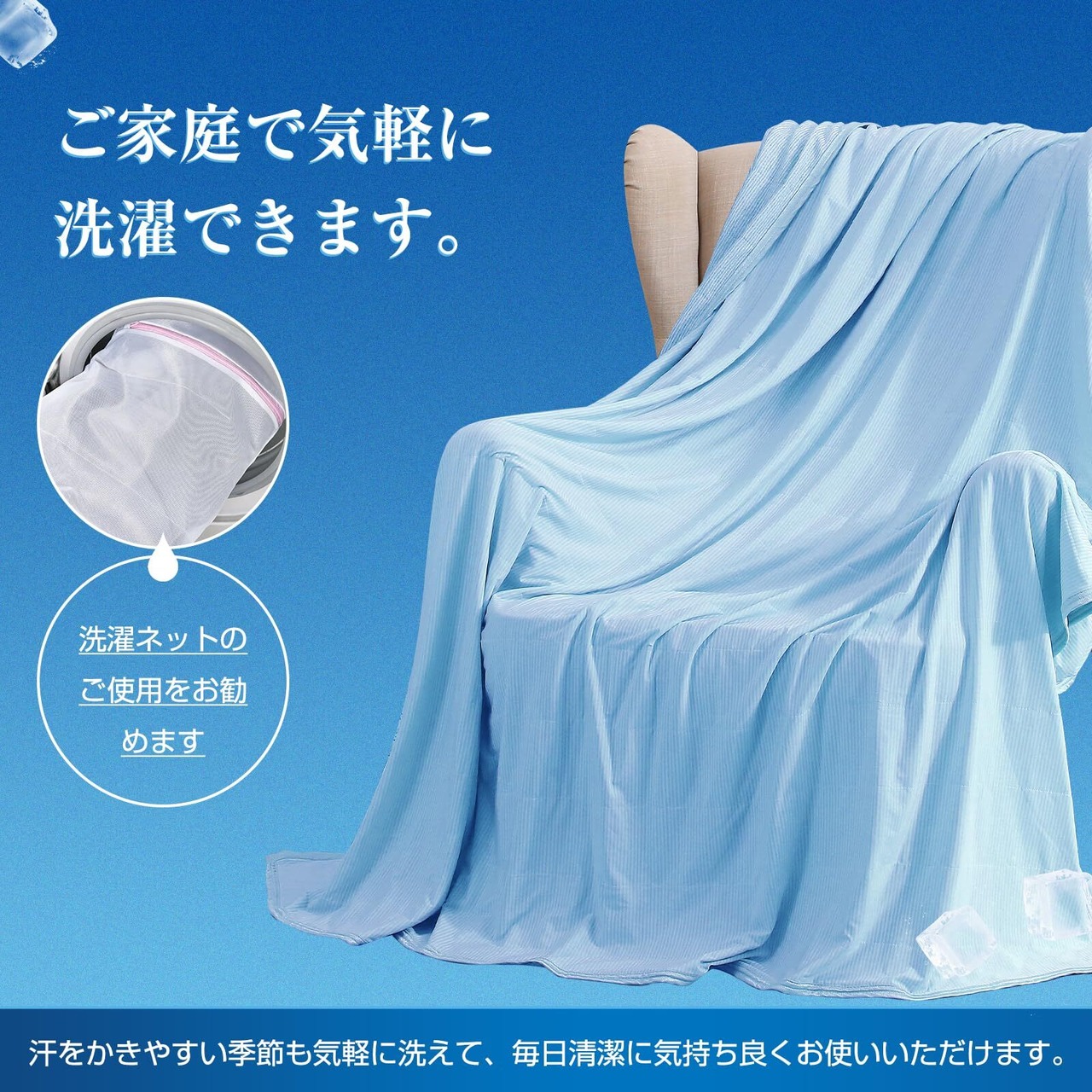 【様々な用途】肩掛けや膝掛けなど、お布団の代わりに掛けても、ベッドシーツとして使っても、いろんな場合で活躍します。【丸洗いでいつでも清潔】汗をが気になる季節に使うものだからこそ、こまめに洗って清潔に。乾きやすい素材なので、ご家庭で簡単にお洗濯ができます。(洗濯ネットのご使用をお勧めます)
