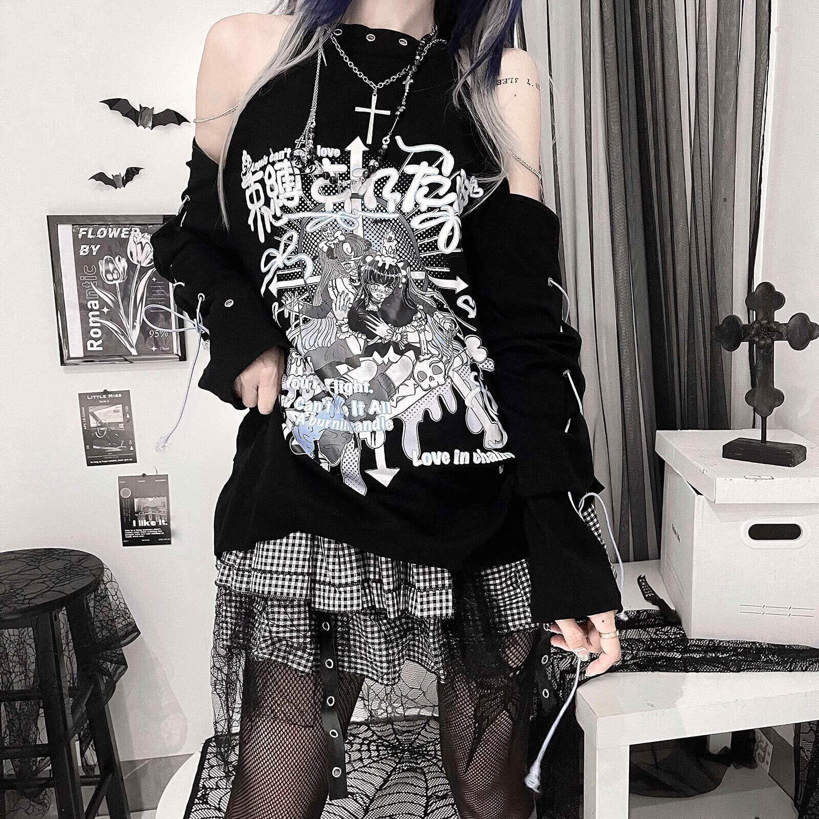 【新登場】:これからの季節に大活躍する肩出し半袖Tシャツは新登場です。 病みかわいいサブカル系スタイルです。