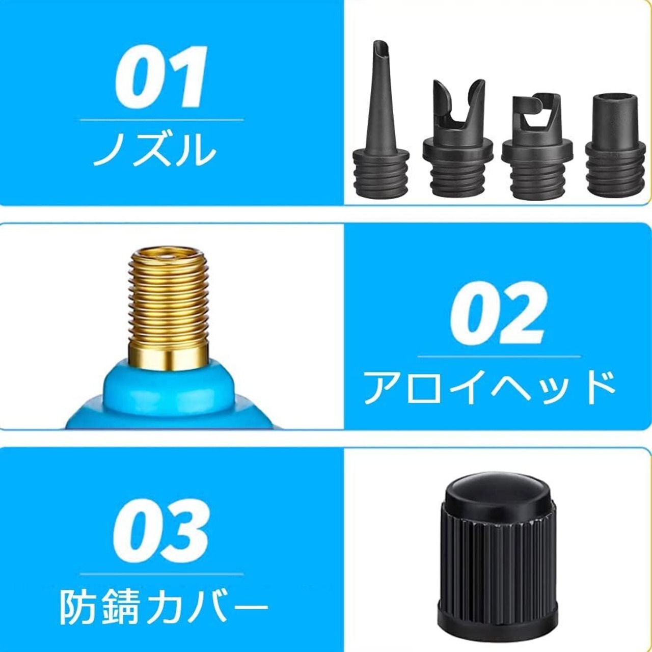 【4種類のノズル】:4つ専門用のノズルが付いているので、様々なバルブに対応できます。変換しやすく、インフレ効率は非常に高いです。だから、特別なゴムボートポンプを購入する必要はありません。
