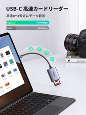 SDカードリーダー Type-C:USB Type 3.1 Gen1コネクタは従来のUSB2.0より約10倍速く、最大5Gpsの高速データ転送を楽しめます。UHS-Iカードに対応し、大容量のHD映画や仕事ファイル、記念写真などを数秒で転送できます。
