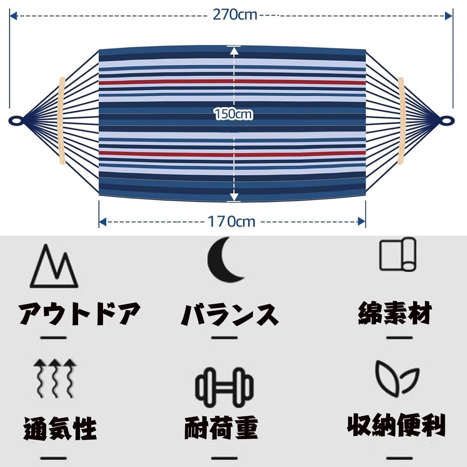 ハンモック2人用 転倒防止 超広い 収納袋付き キャンプ ピクニック アウトドア ダブル ハンモック 肌触り良い コンパクト 公園 吊り下げ式 (青ボーダー)