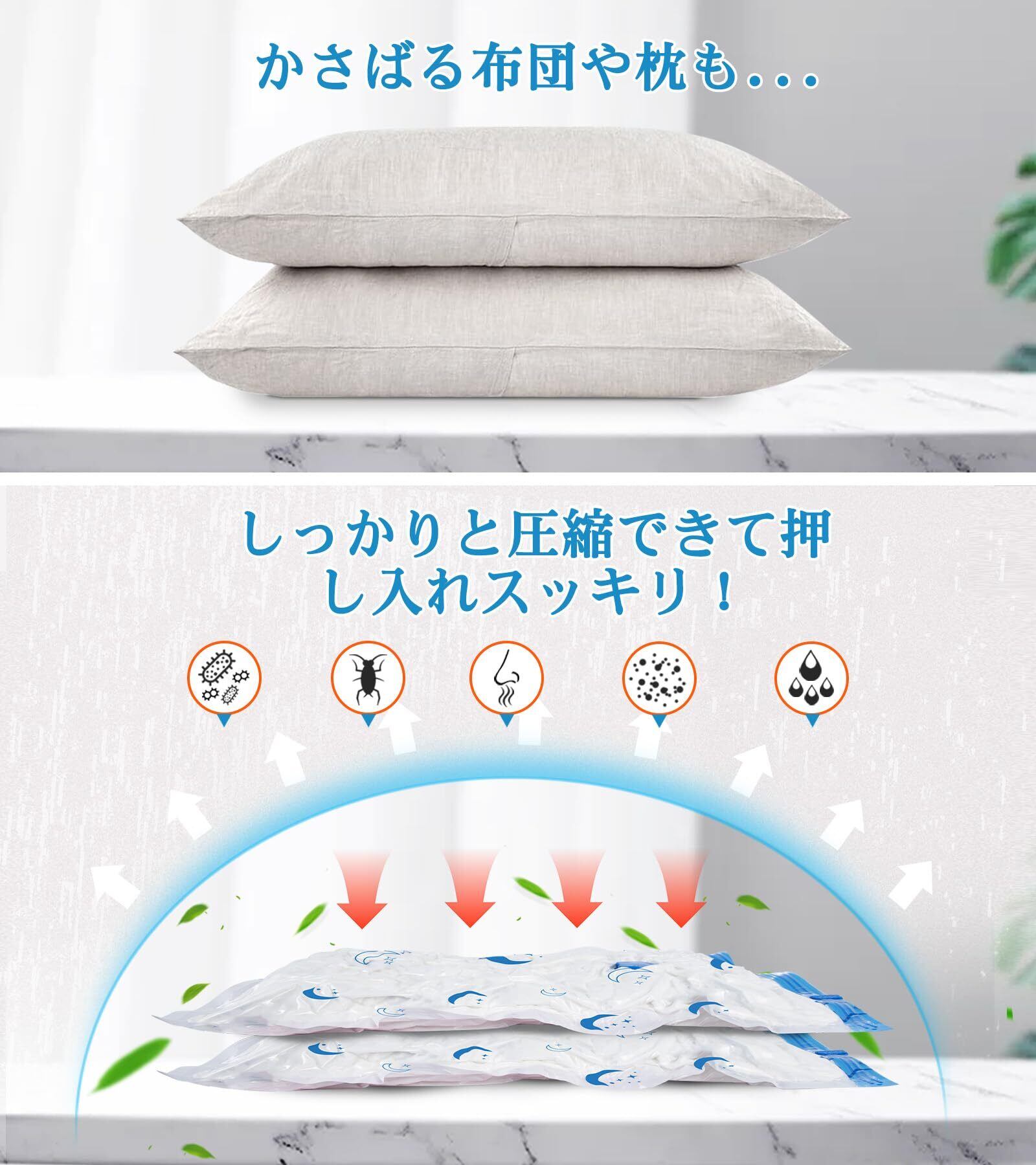 【最大限のスペース節約!75%の空間効率化】6枚圧縮袋(80*56cm)、衣類、ダウンジャケット、布団、枕、シーツ、寝袋、ブランケットなどの収納すすめ!これにより、75%もの空間を節約できるため、クローゼットや押入れの中でも効率的にスペースを活用することができます。掛け布団や毛布をコンパクトに保管し、整理整頓された環境を実現しましょう!