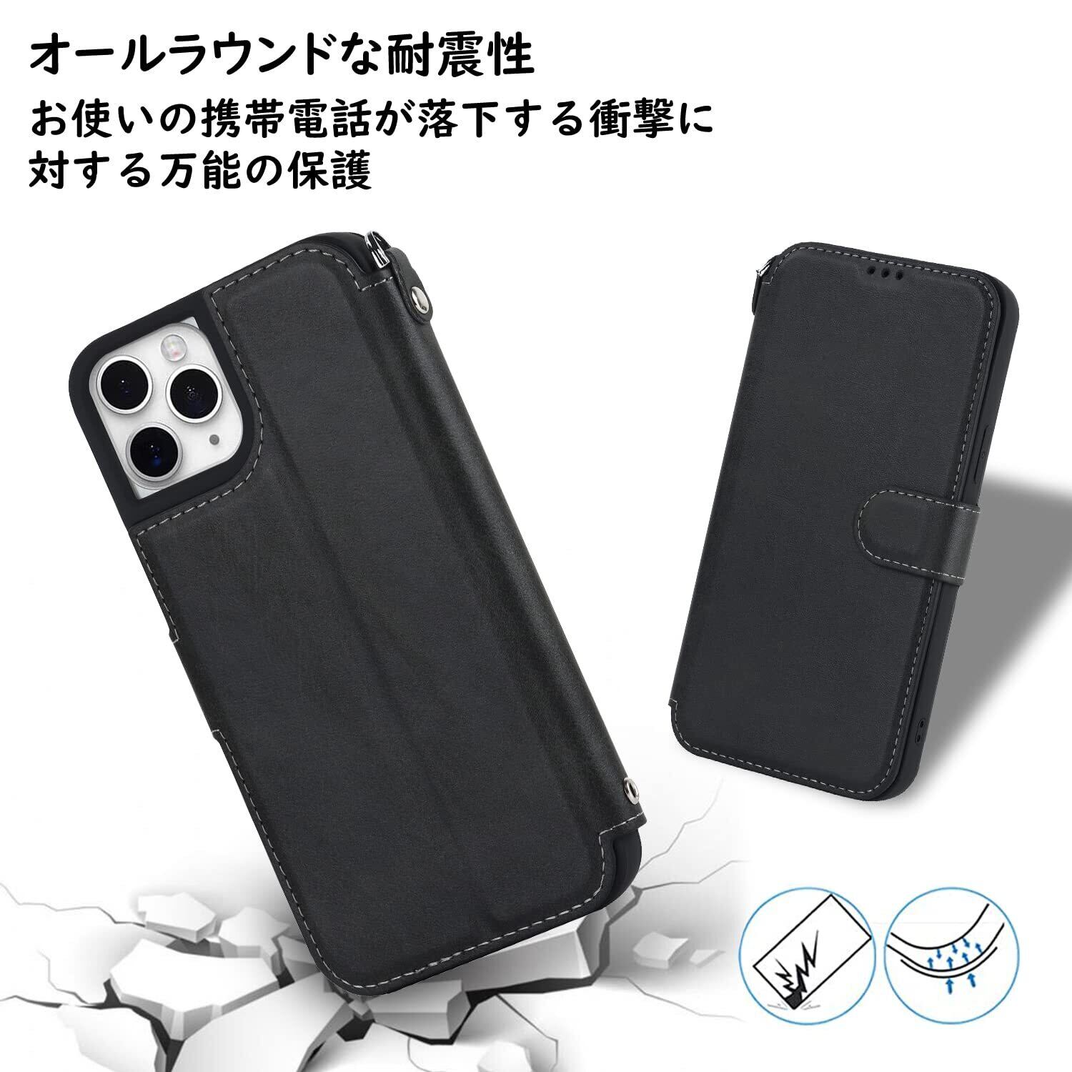 Havaya iPhone11ProMax ケース iphone 11 pro max ケース スマホケース 米軍MIL規格 軽薄 手帳型 ストラップ 耐衝撃 レンズ保護(アイフォン11プロマックス /あいふぉん11promax/いphone11promax/アイホン11プロマックス 6.5インチ対応)-ブラック