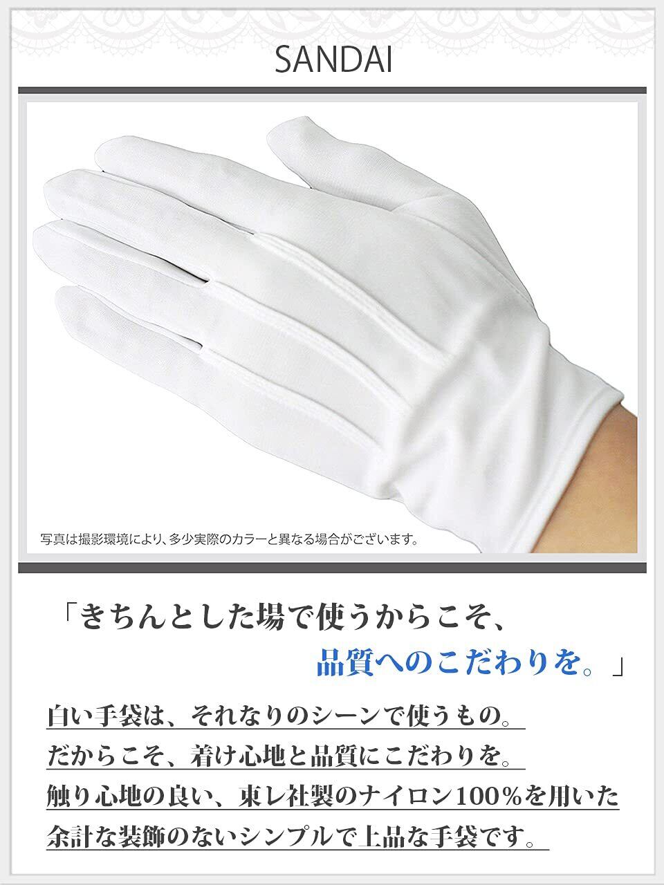 白い手袋は、それなりのシーンで使うもの。だからこそ、着け心地と品質にこだわりを。触り心地の良い、東レ社製のナイロン100%を用いた余計な装飾のないシンプルで上品な手袋です。