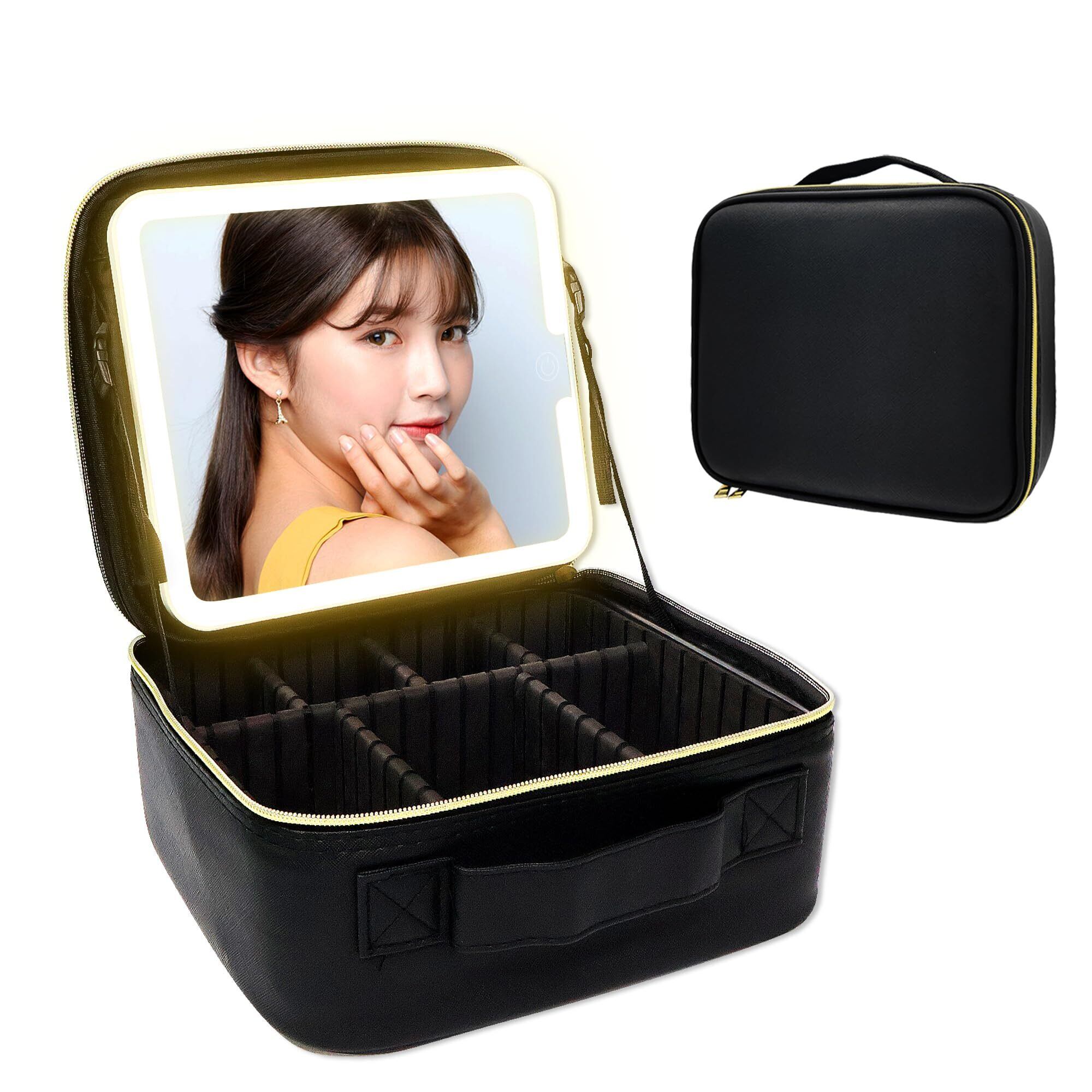 メイクボックス 鏡付き LEDライト付き コスメボックス 3色照明 無段階調光 10倍拡大鏡 USB充電式 大容量 コスメ収納 メイクブラシ入れ 持ち運び 旅行 出張用 メイクポーチ (ブラック)