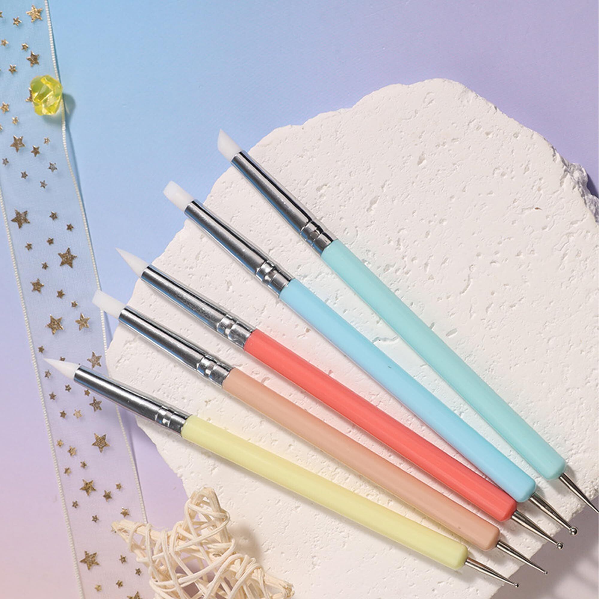 【セット内容】セット内容は、両端ヘッドのネイル 筆5本が含まれています。一端はドットペン、もう一端はシリコンブラシ。プロのネイリストが自信を持って推奨する必需品のドットペンを丁寧に選びました。これにより、自宅で美しいネイルを簡単に作成できます。