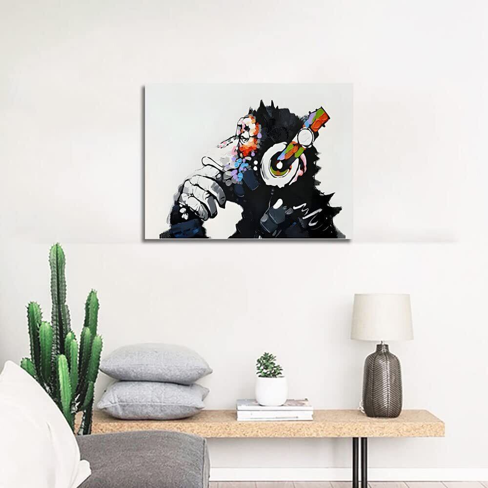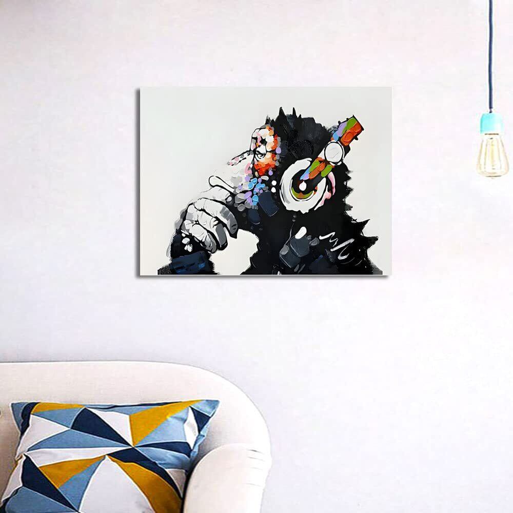 『音楽を聴いている猿』 バンクシー Banksy ポスター チンパンジー キャンバス アートパネル 抽象 絵画 漫画 現代 壁絵 落書き かわいい 動物 モダン ファッション動物油絵ゴリラ 壁飾り インテリア 玄関アートパネル 贈り物 木枠付きの完成品