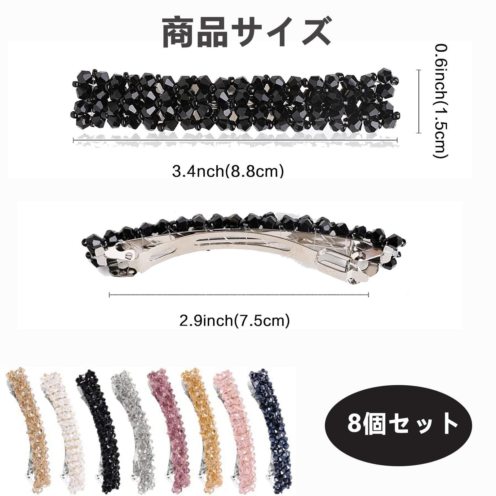【8個セット】:8色のクリスタルヘアピンが届きます。ヘアピンの長さは約9 cm、幅は約1.5 cm、1個の重さは約10 g。色は多様で、自分の服装や日常の気分、日常の活動に合わせて適切な色を選ぶことができます。