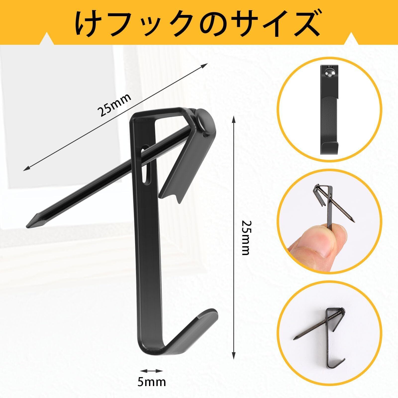 傷つけない: 従来の接着剤やマグネットフックではなく、傾斜した壁掛けフックの別れるデザインを採用しています。石膏ボード フックの針は非常に細く、壁にしっかり固定され、簡単には外れません。使用後、簡単に取り外し、小さな針穴だけが残り、壁に多くの損傷を与えることなく簡単に修復できます