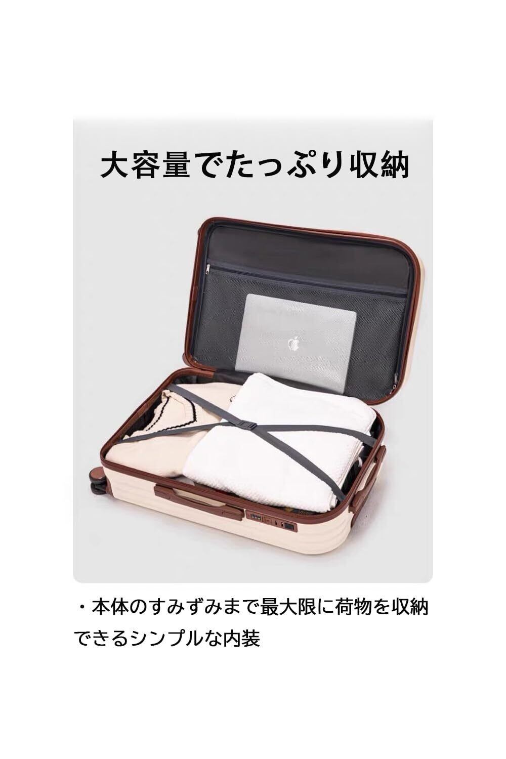 【ミニケース付き】荷物をしっかり固定するためのクロスバンド、一目で中身が分かるメッシュポケット、小さいケースは化粧品やバスアメニティや貴重品などの小物の小物を収納でき、小物の整理に便利な設計になっています。